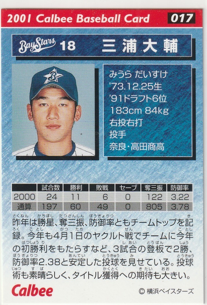 ●2001カルビー 【三浦 大輔】プレ版:金箔押サインパラレル No.017:横浜