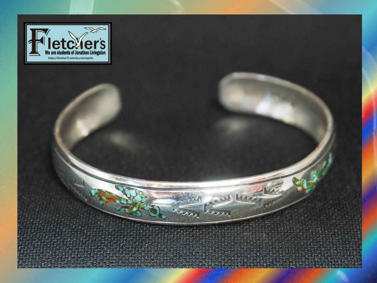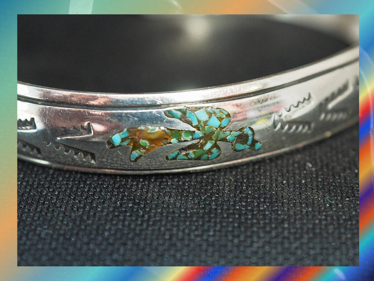 質感有るシルバーの地金にはナバホ族特有の紋様がハンドスタンプされ、クラッシュインレイ工法と呼ばれる、クラッシュさせたターコイズを文様に埋め込んで彩りを与える方法で、ペヨーテバードを描き混んでいます。