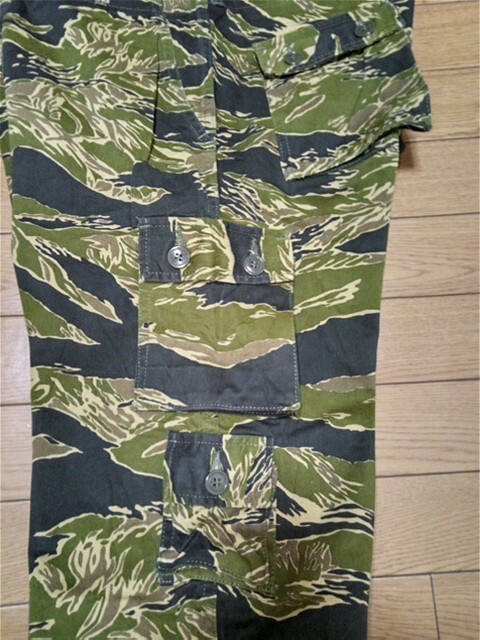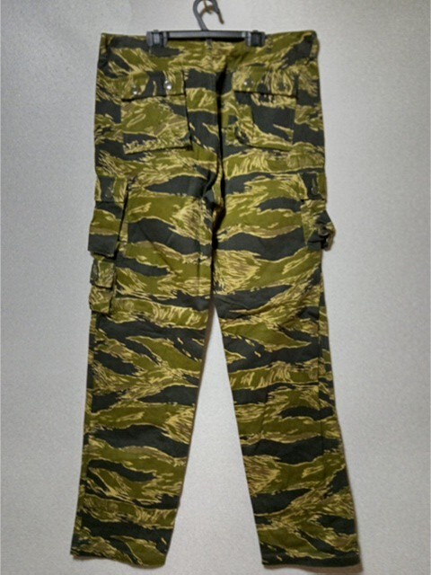 有難うございます。サイズR-XL ウエスト平置約44.5cm,レングス約84cm,裾幅約21cmです。MADE IN JAPAN リアルマッコイズ タイガーストライプカモ カーゴパンツです。状態は概ね画像通りになります。古着になりますが使用感少なく目立つようなダメージ等はございません。生地もハリがあり概ね良好なコンディションかと思います。レターパックプラス送料無料ですのでよろしくお願い致します。