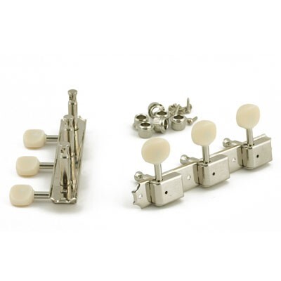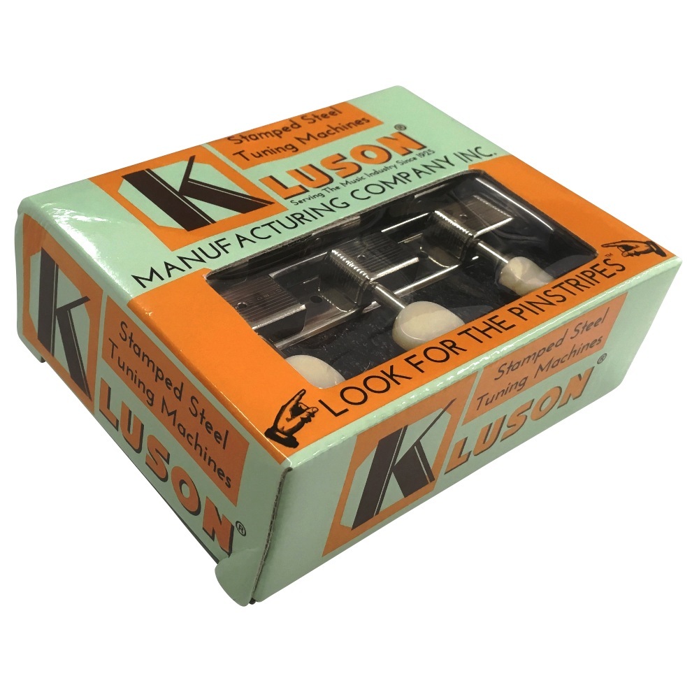 1956年後半から64年後期にかけての本体に取り付けられていた、ベース部分が一体となった片側3連のスタイルで、白いプラスティック製の丸型チューニング・ノブを備えた“クルーソン・デラックス”「1列刻印」、ニッケル・メッキ仕様の復刻ペグ。