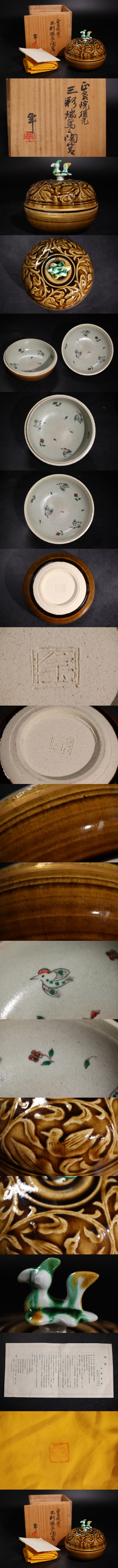 | 加藤卓男 「 正倉院 復元 三彩 瑞鳥文 陶筥 」 栞・共布・共箱付 / 人間国宝 黄釉 煎茶道具 .G2619 |