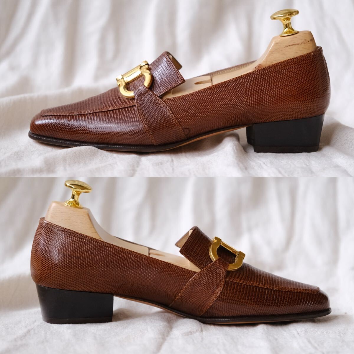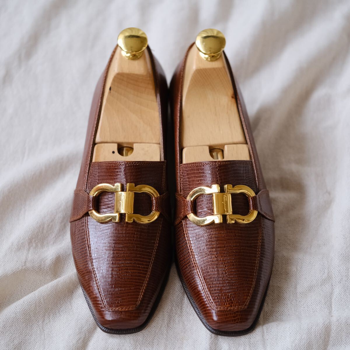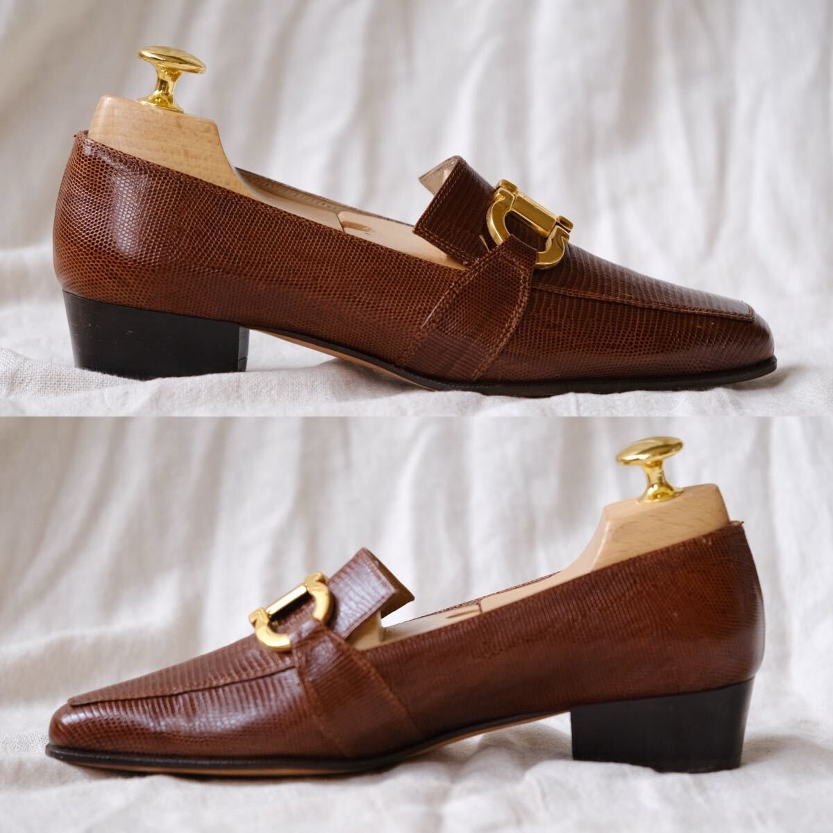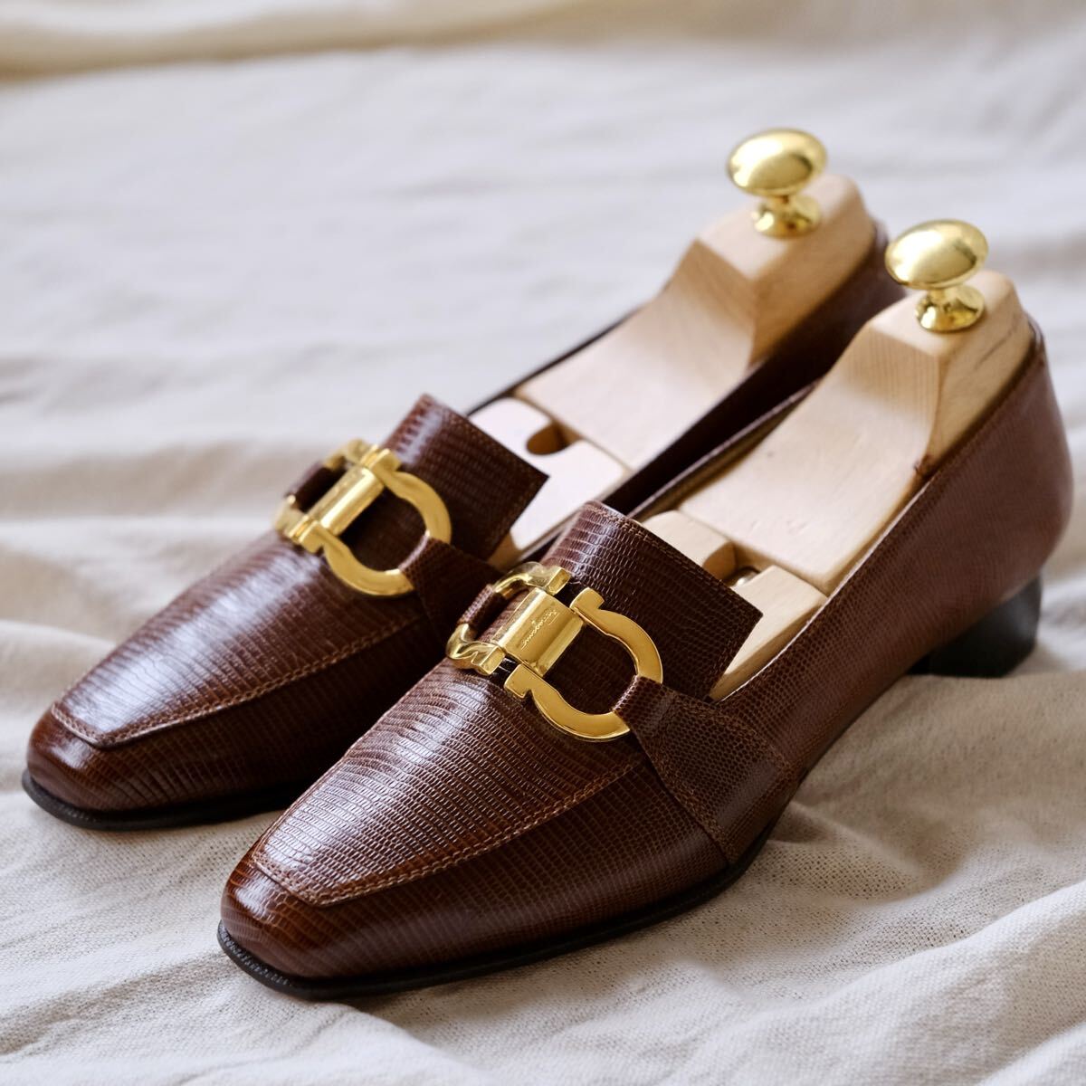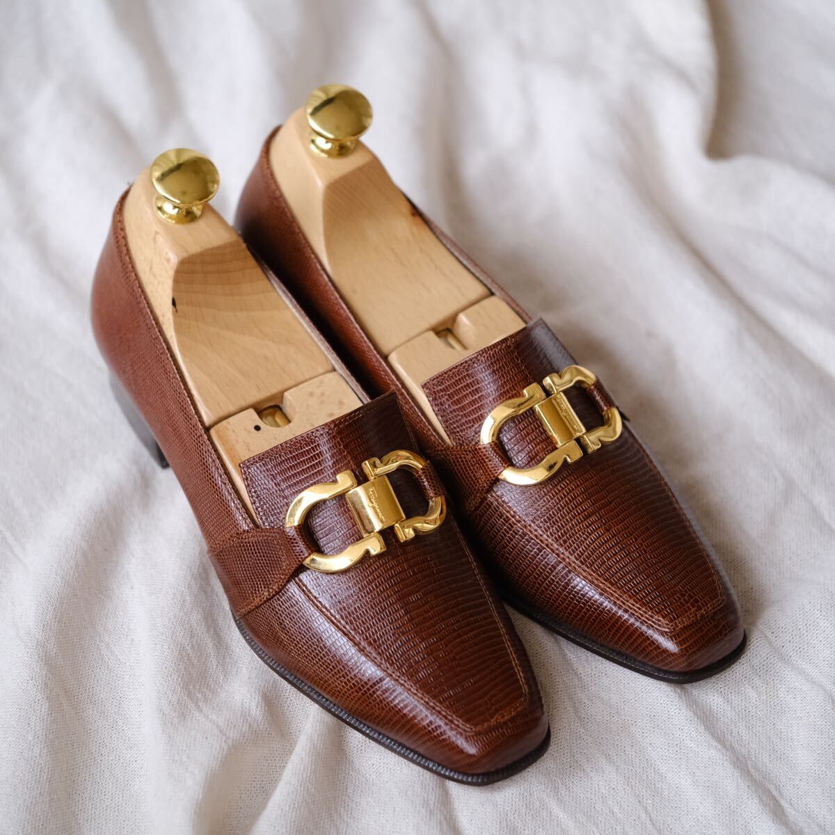 優れた艶感と大型ゴールドガンチーニのコンビは合わせやすさと高級感を共存させ、華奢なフェラガモアッパーとの調和が魅力的な一足。