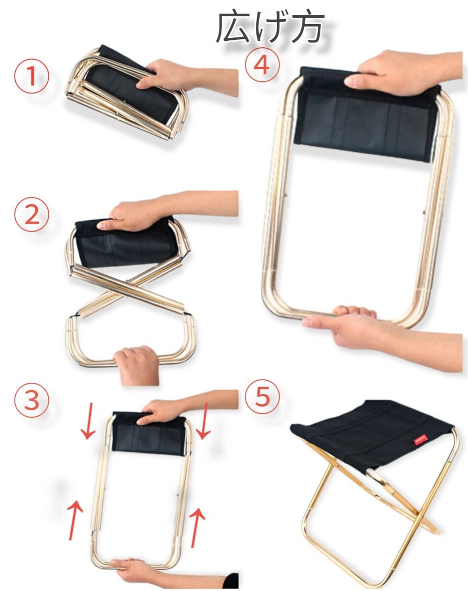 収納袋から出して、スタンドの各部分連結して、座面表の方向を確認して、上から広げます。逆方向に広げると座面が裏表になりますので、ご注意下さい。不良品ではありません。