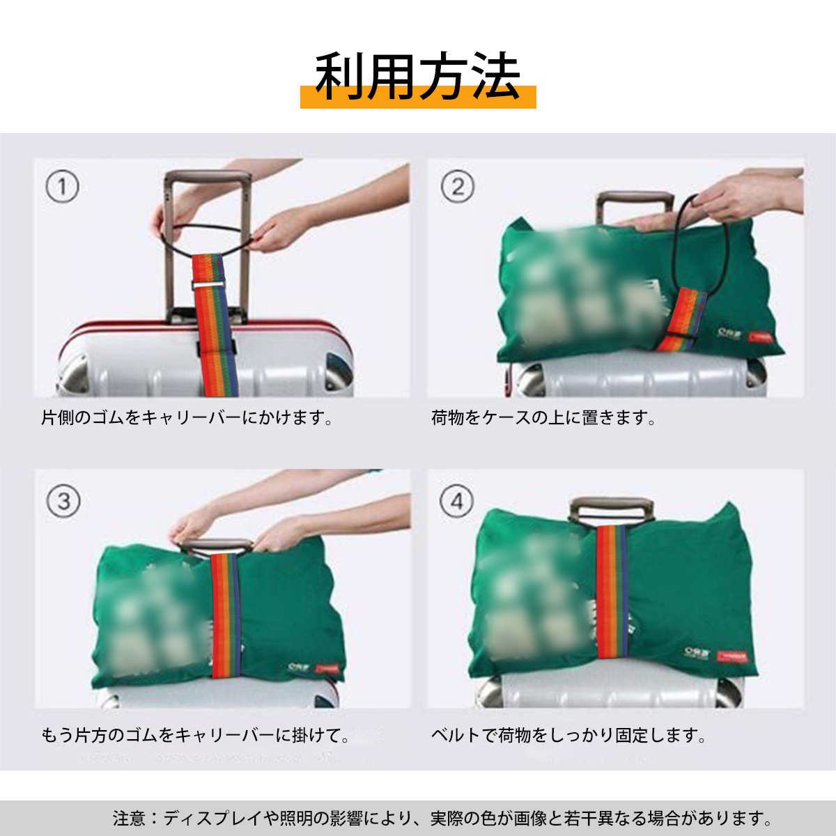 使用方法 | 1. ラゲッジストラップの片側にあるプルリングをラゲッジハンドルに差し込みます。 2. 手荷物を荷物ストラップに置きます 3. 反対側のプルタブを引き上げ、スーツケースのレバーに差し込みます。 4. 調整して固定します。 |