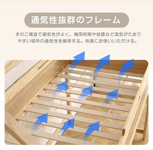 • 6.【空気流通性にも優れる】脚床面が高くなっているため、下の空間が通気性がよくなり、湿気やカビ、ダニの繁殖を防ぐことができます。さらに、重量を分散することで、安定感が増し、より安心してご使用いただけます。
