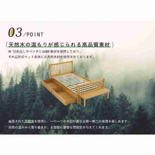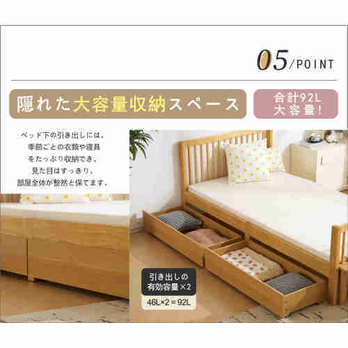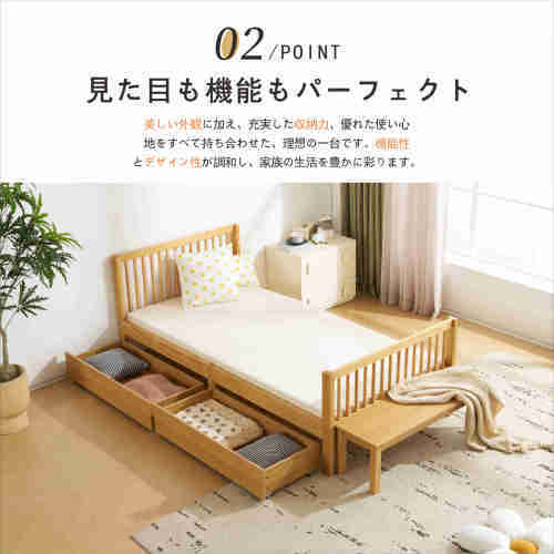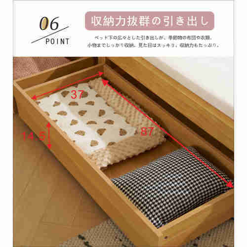 • 【収納力抜群の引き出し】ベッド下の広々とした引き出しが、季節物の布団や衣類、小物までしっかり収納。見た目はスッキリ、収納力もたっぷり。