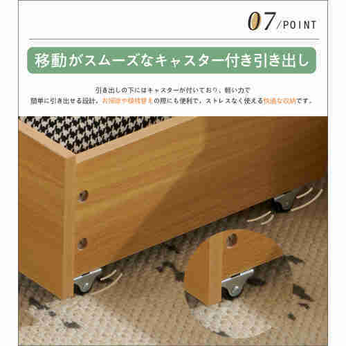 • 【移動がスムーズなキャスター付き引き出し】引き出しの下にはキャスターが付いており、軽い力で簡単に引き出せる設計。お掃除や模様替えの際にも便利で、ストレスなく使える快適な収納です。【左右入れ替え可能な引き出し】左右入れ替え可能な引き出し