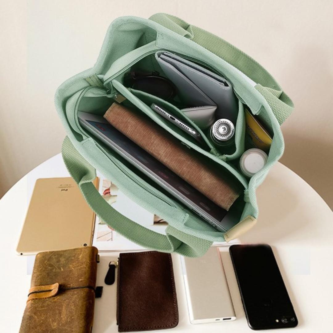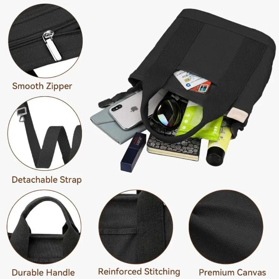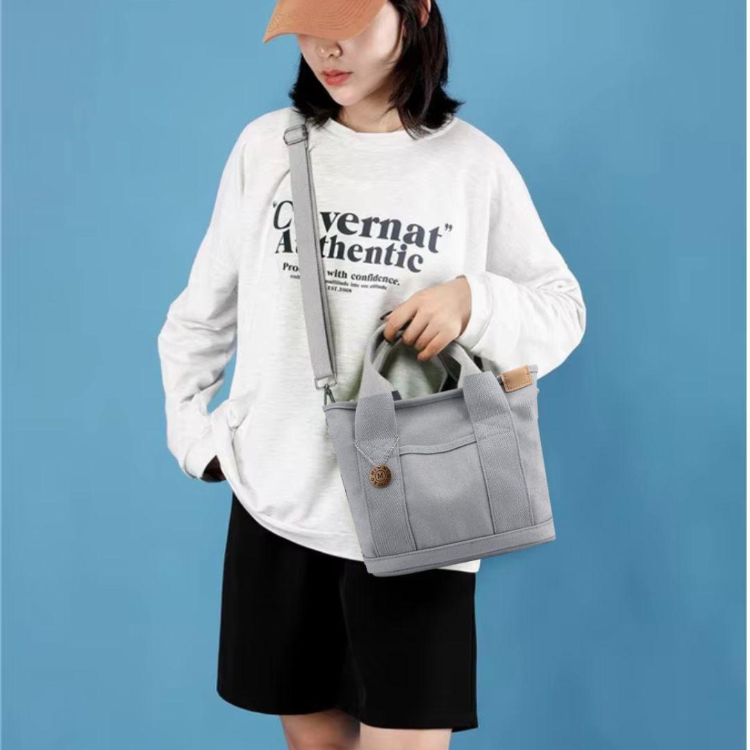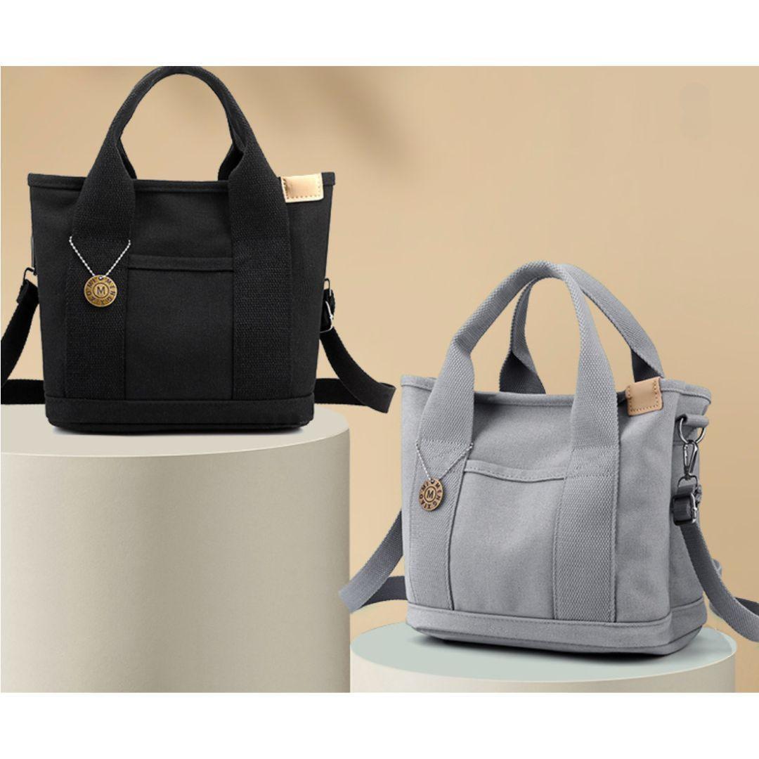 買い物、外出、散歩、通勤、通学など、小物類やお弁当箱を入れるのに最適なミニトートバッグの2WAYショルダーストラップ付き