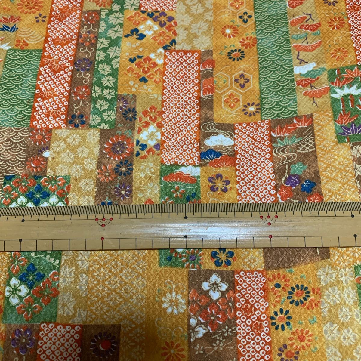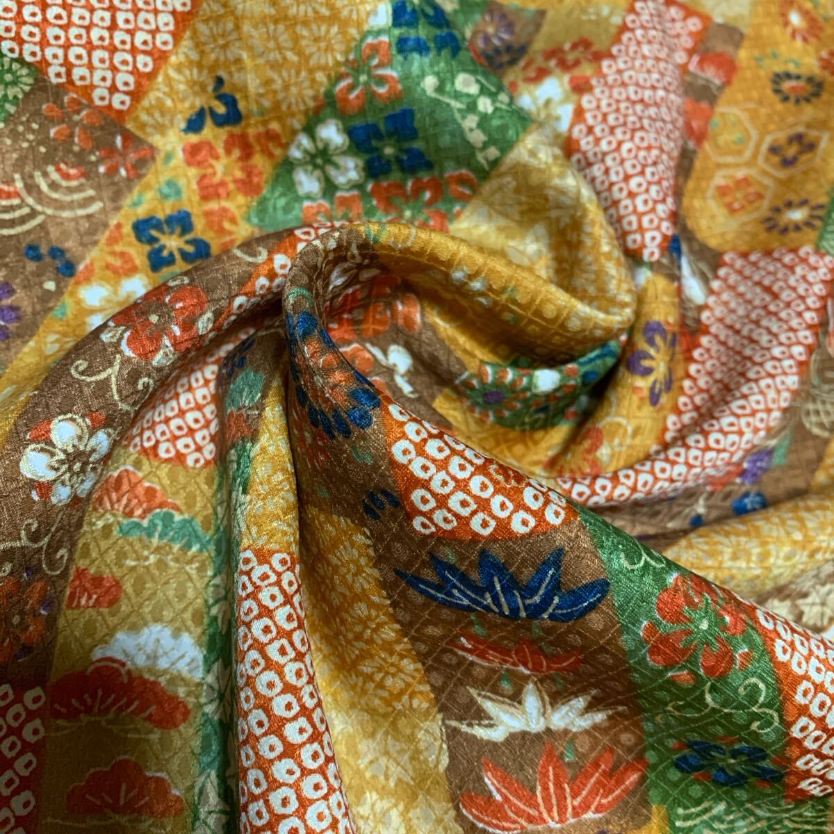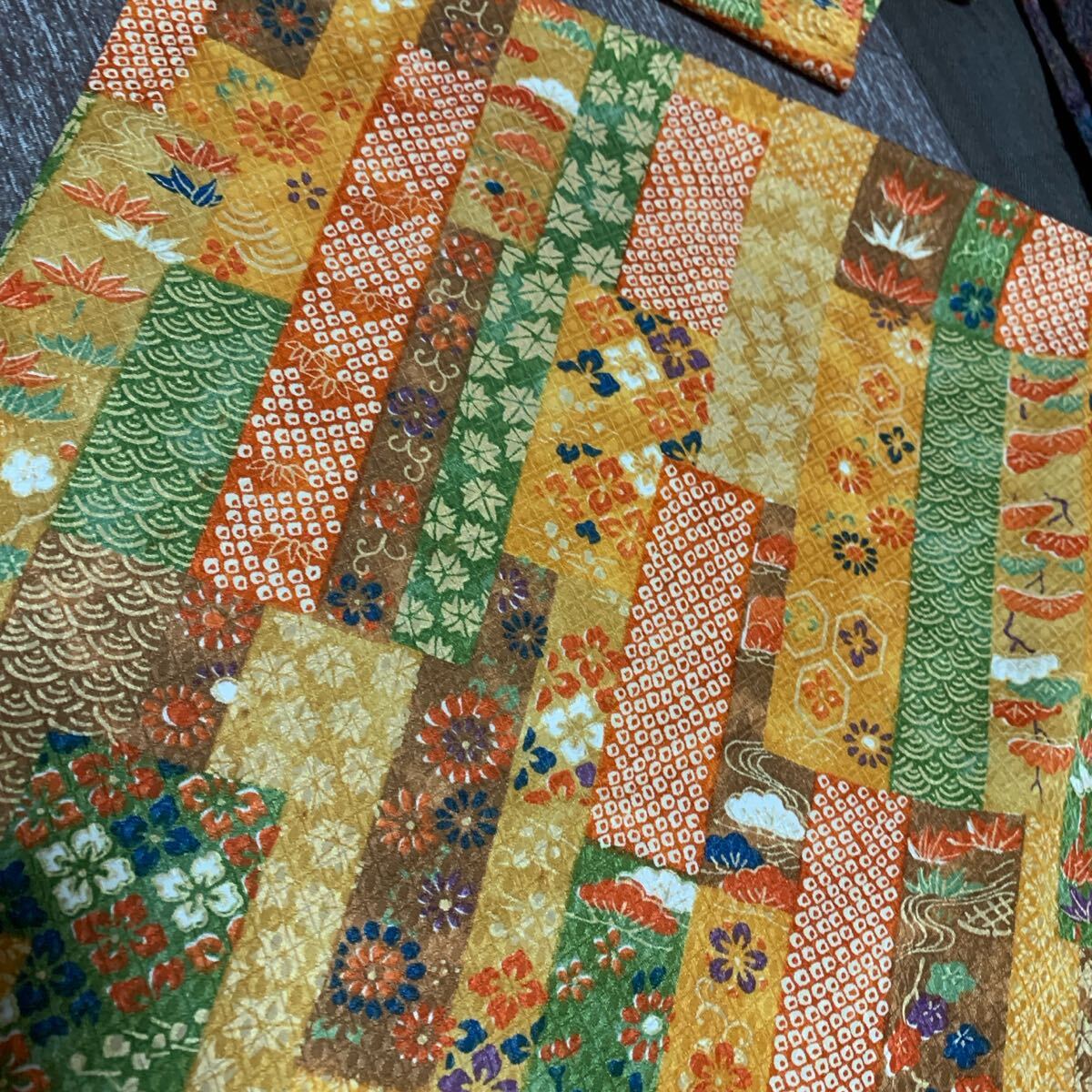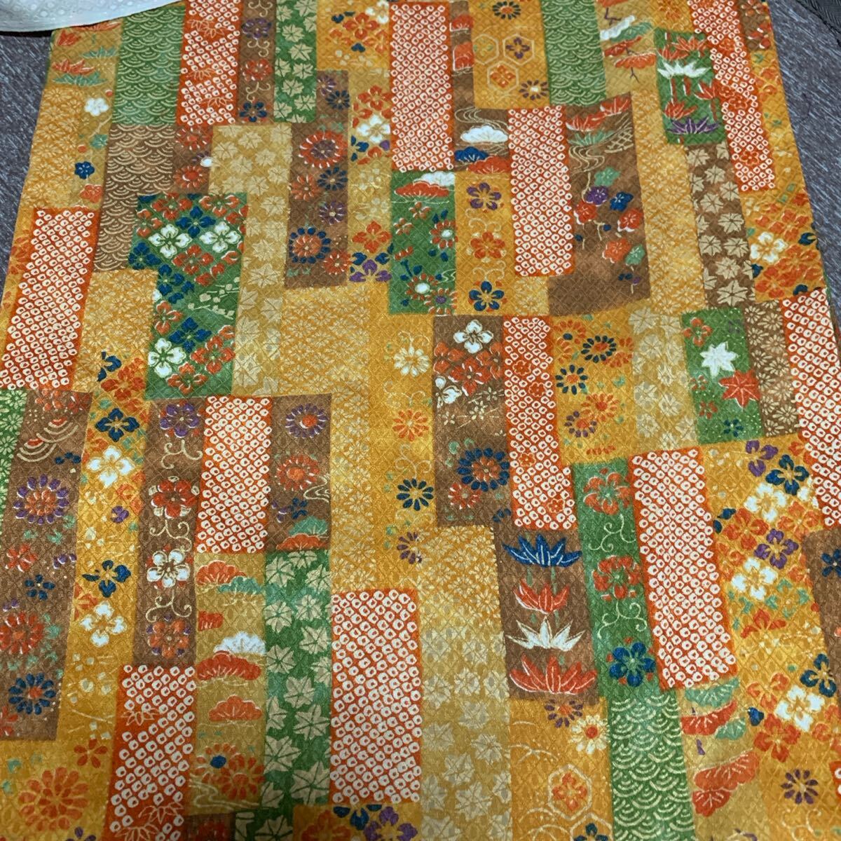 正絹 約35×170 オレンジ緑茶カラフル短冊繋ぎ 小花 古典文様 豪華 派手 かわいい 長め 多量
