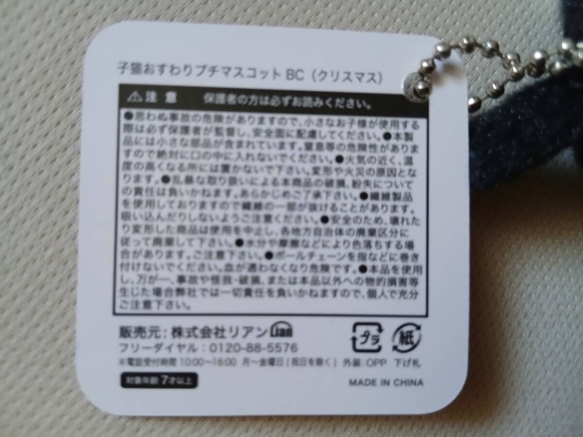 ★子猫おすわりプチマスコット BC(クリスマス) です。クレーンゲームで獲得し、袋に入れて保管していた新品・美品のアミューズメント品です。最後の一品です。