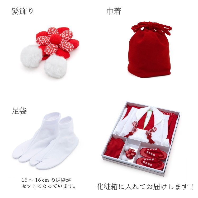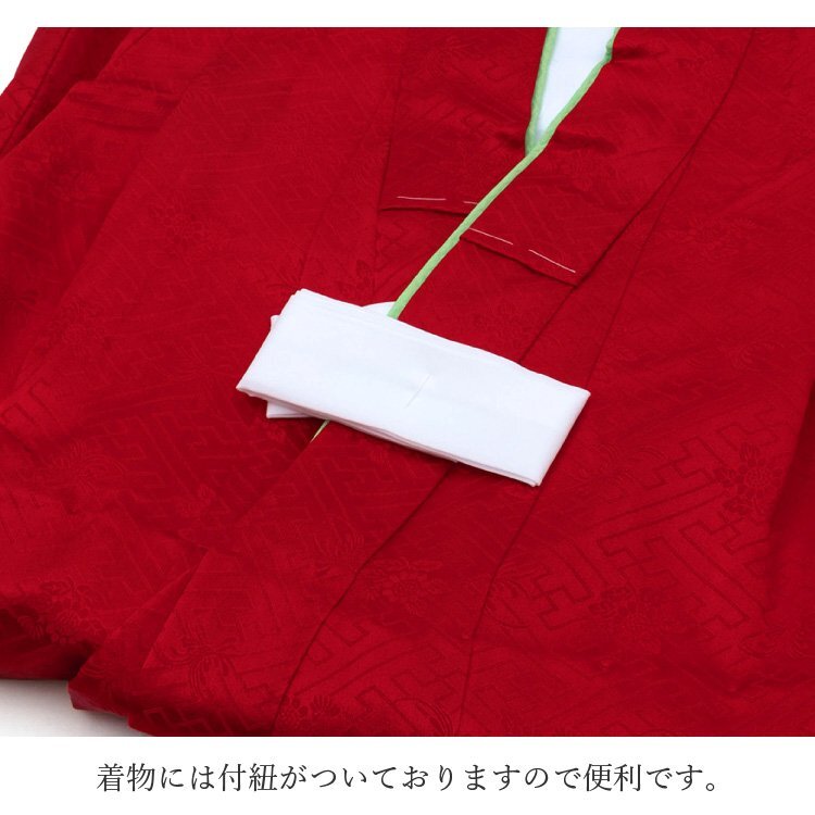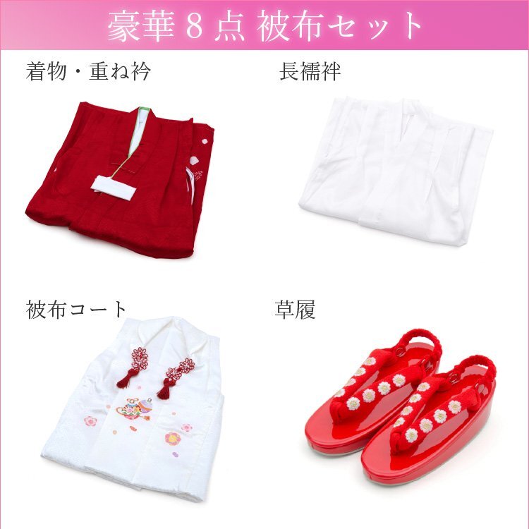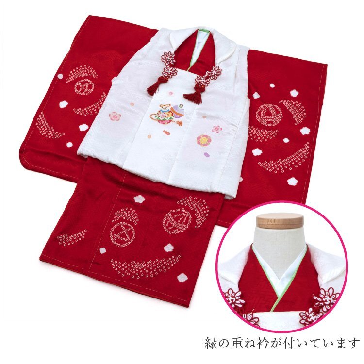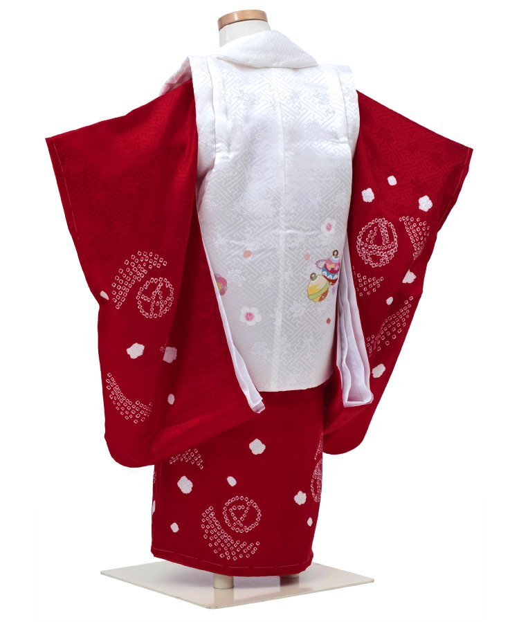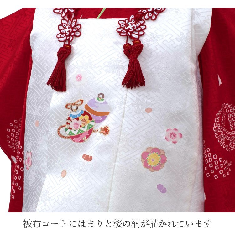 商品説明 | 地模様入りの生地で赤色のお着物に白色の被布コートを合わせた七五三3歳用の被布着物フルセットです。 御祝着に最適な賑やかな柄になります。 肩揚げと腰揚げもしてあり、お子様の体型にもよりますが身長95cm前後であればお直しなしで着用していただけます。 着用はお着物に紐が付いていますので便利です。 |