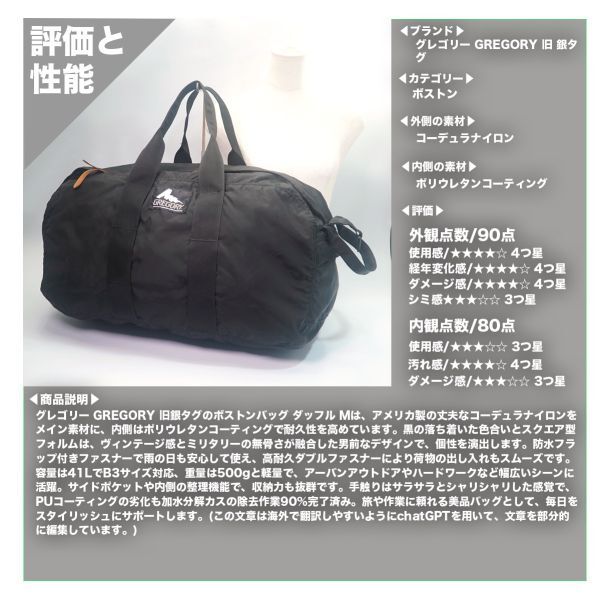 グレゴリー GREGORY 旧銀タグのボストンバッ グ ダッフル Mは、アメリカ製の丈夫なコーデュラナ イロンをメイン素材に、内側はポリウレタンコーティン グで耐久性を高めています。黒の落ち着いた色合いとス クエア型フォルムは、ヴィンテージ感とミリタリーの無 骨さが融合した男前なデザインで、個性を演出します。 防水フラップ付きファスナーで雨の日も安心して使え、 高耐久ダブルファスナーにより荷物の出し入れもスムー ズです。容量は41LでB3サイズ対応、重量は500 gと軽量で、アーバンアウトドアやハードワークなど幅 広いシーンに活躍。サイドポケットや内側の整理機能で 、収納力も抜群です。手触りはサラサラとシャリシャリ した感覚で、PUコーティングの劣化も加水分解カスの 除去作業90%完了済み。旅や作業に頼れる美品バッグ として、毎日をスタイリッシュにサポートします。(こ の文章は海外で翻訳しやすいようにchatGPTを用 いて、文章を部分的に編集しています。)■取引(落札/発送/トラブル/返品)