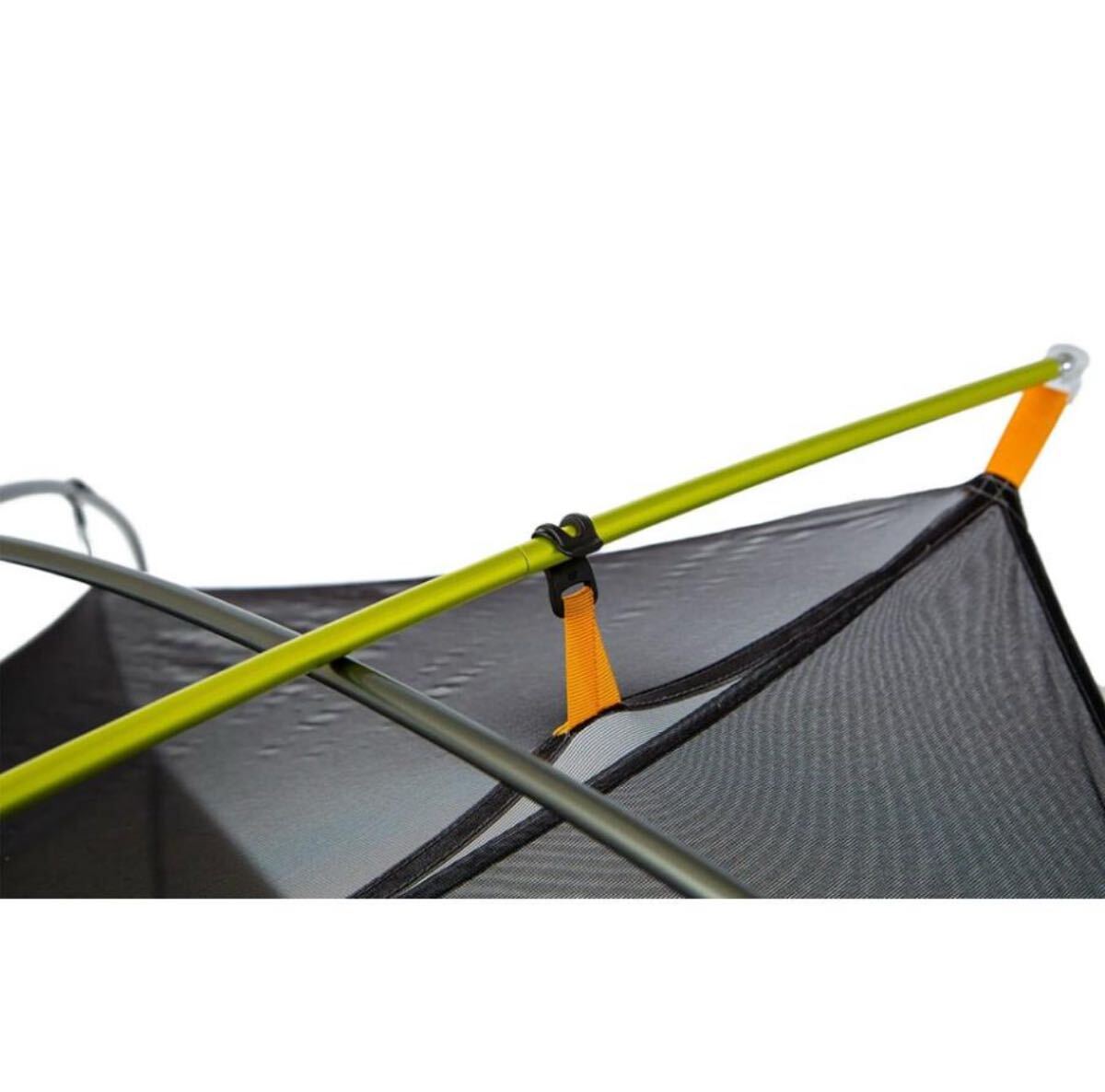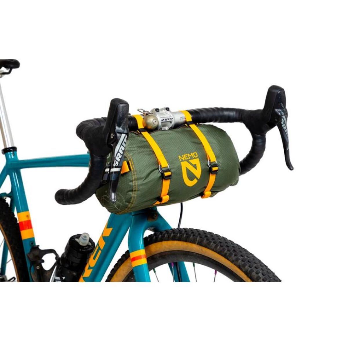 オズモファブリックを採用することで一般的なテントよりも優れた撥水性を約4倍長くさせ、濡れた状態でも生地が伸びにくくなりました。ポールの収納サイズを短く設計し、バイクパッキングに最適な固定用ストラップ付きの専用スタッフサックに収納することでバイクのハンドルバー、ラック、フレームまたはフォークに簡単かつ安全にホールドできます。