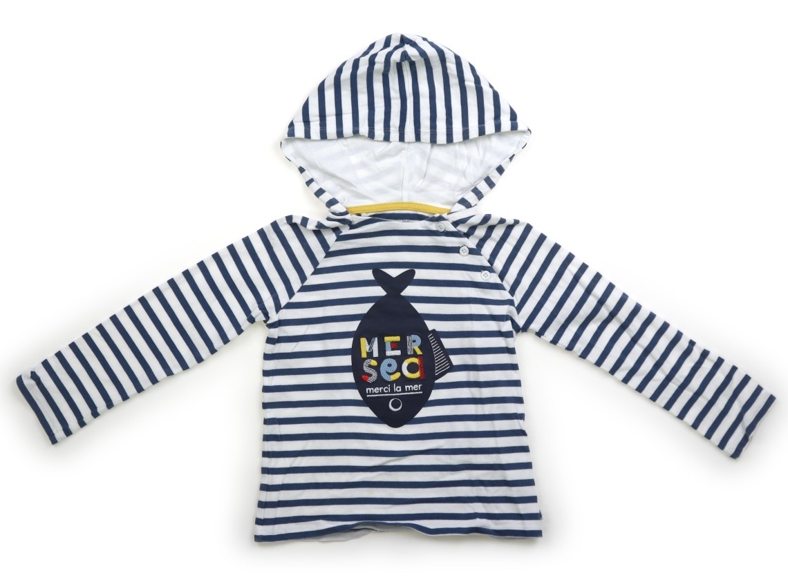 実際のサイズ表記は98cm。天竺コットン。フードにのみ裏地付き。全体的に色褪せがあります。まだお使いいただけそうです。