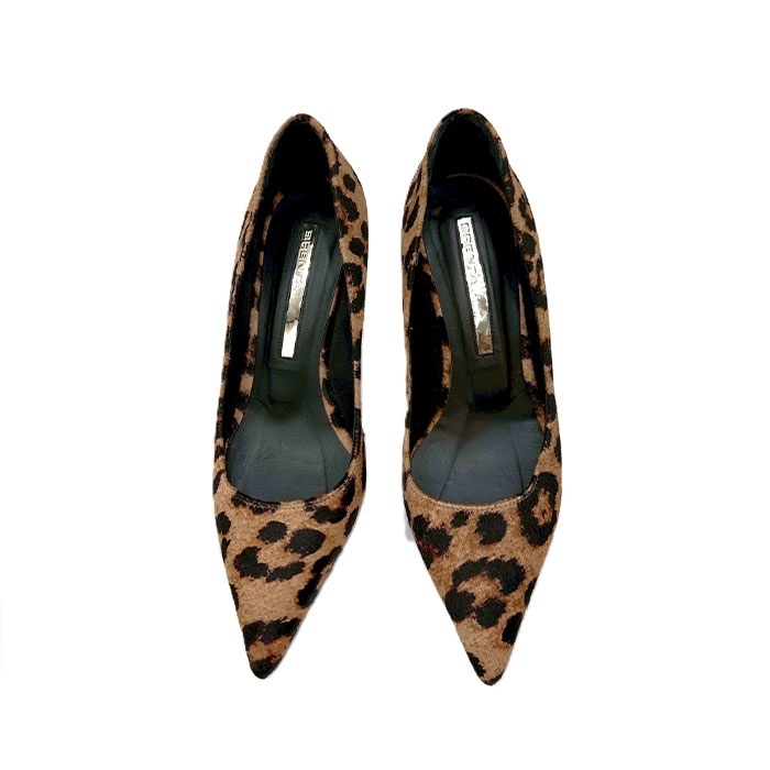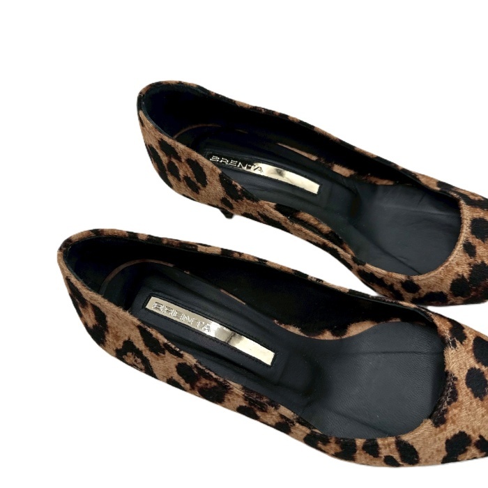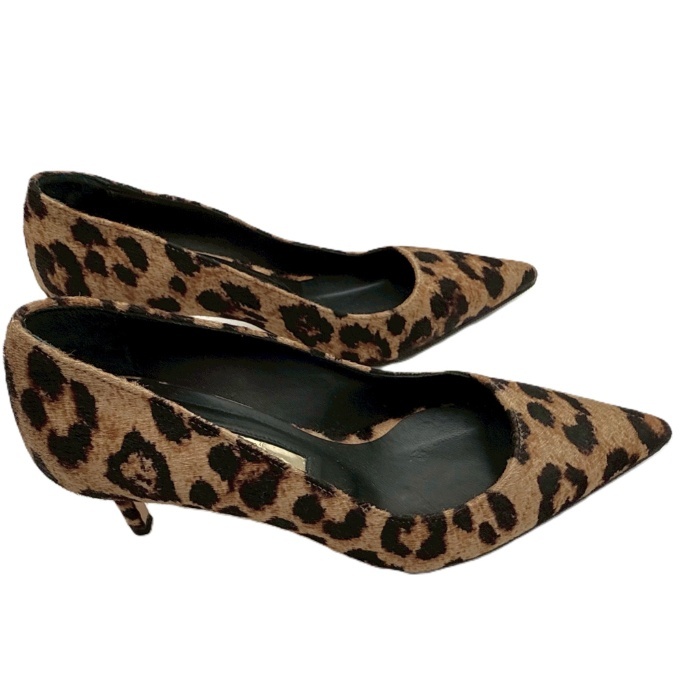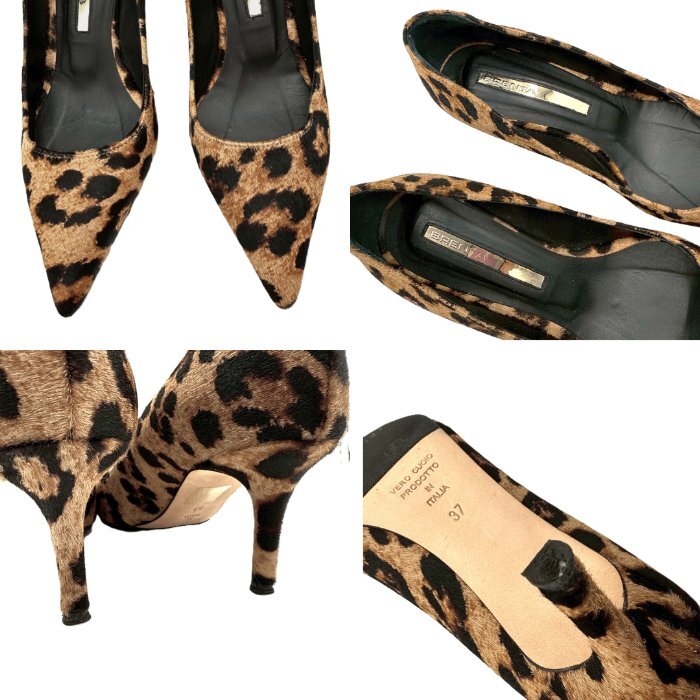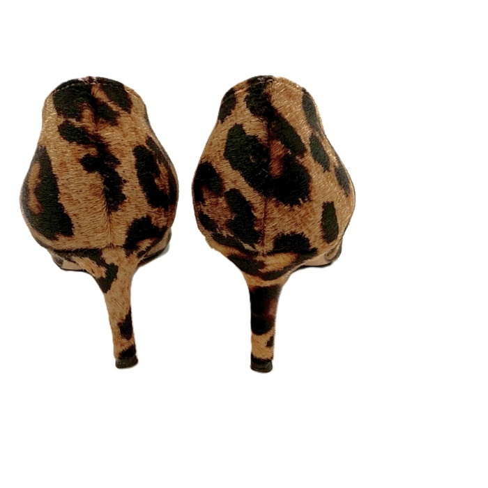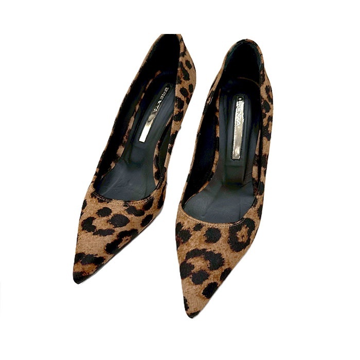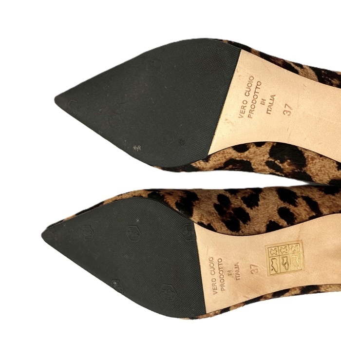 【コメント】 綺麗なシルエットのハラコレオパードパンプスです。ピンヒールのゴム部分が削れて中の金具が見えています。その他は気になる汚れや傷はなく、綺麗なお品物です。 |