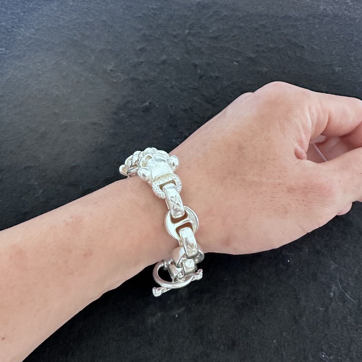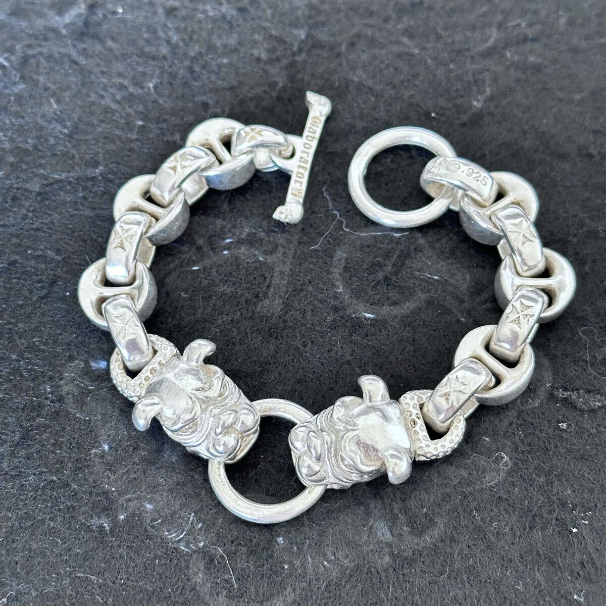 シルバー925製のドッグブレスレットは、ガボールやビルウォールレザーなど芸能人にも人気のデザインです。重厚感としっかりした作りが特徴で、迫力と可愛らしさを兼ね備えています