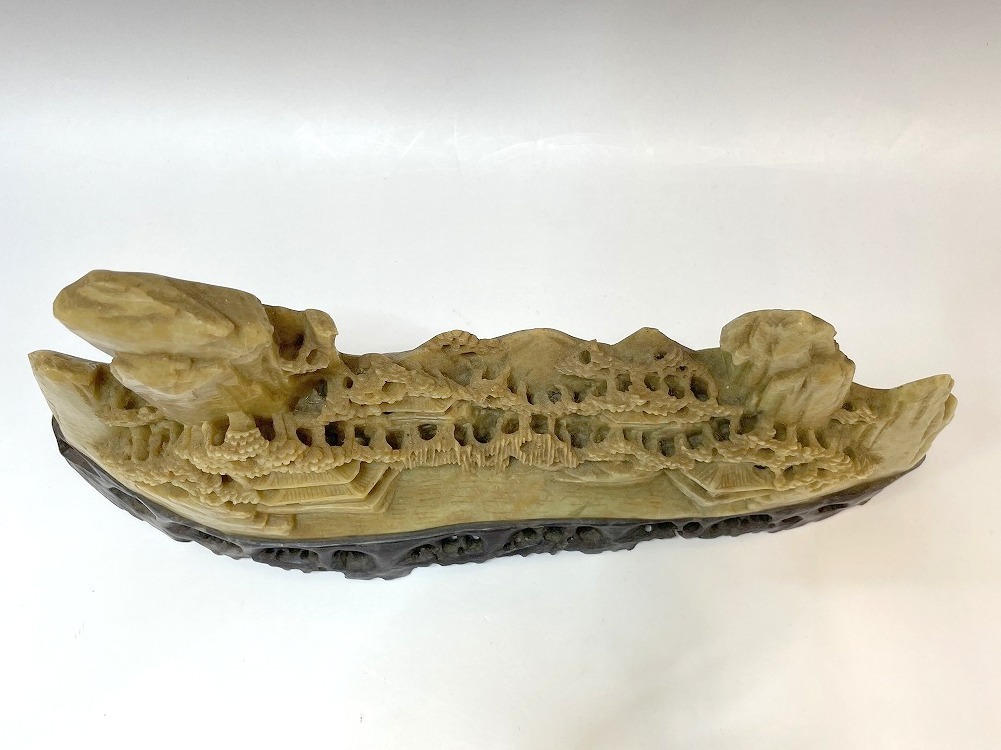 蔵出し!細密彫刻!中国美術 玉石 楼閣山水 置物 重量2kg 幅30×高さ15×奥行6.5cm 天然石 東洋彫刻 骨董 アンティーク