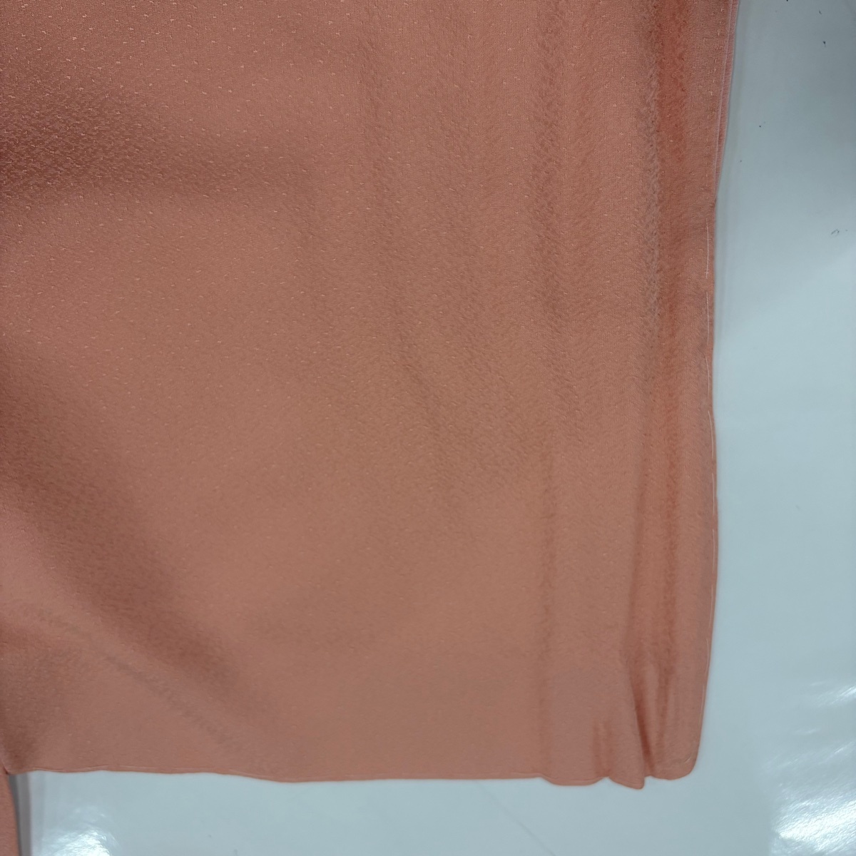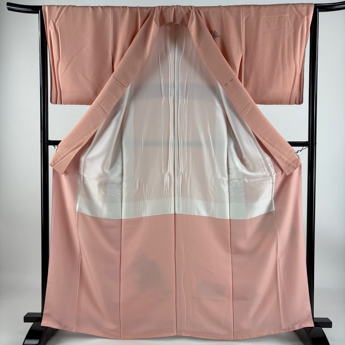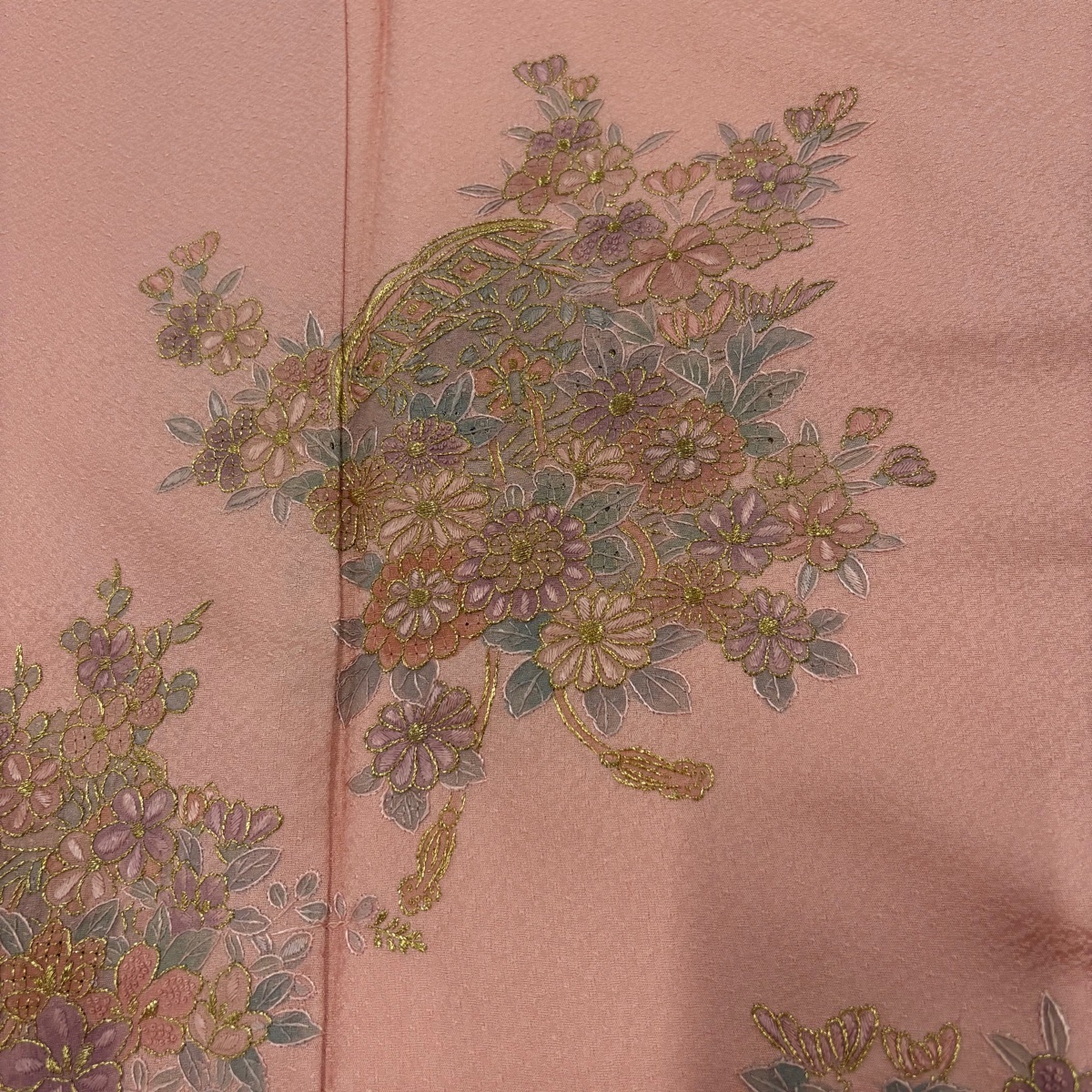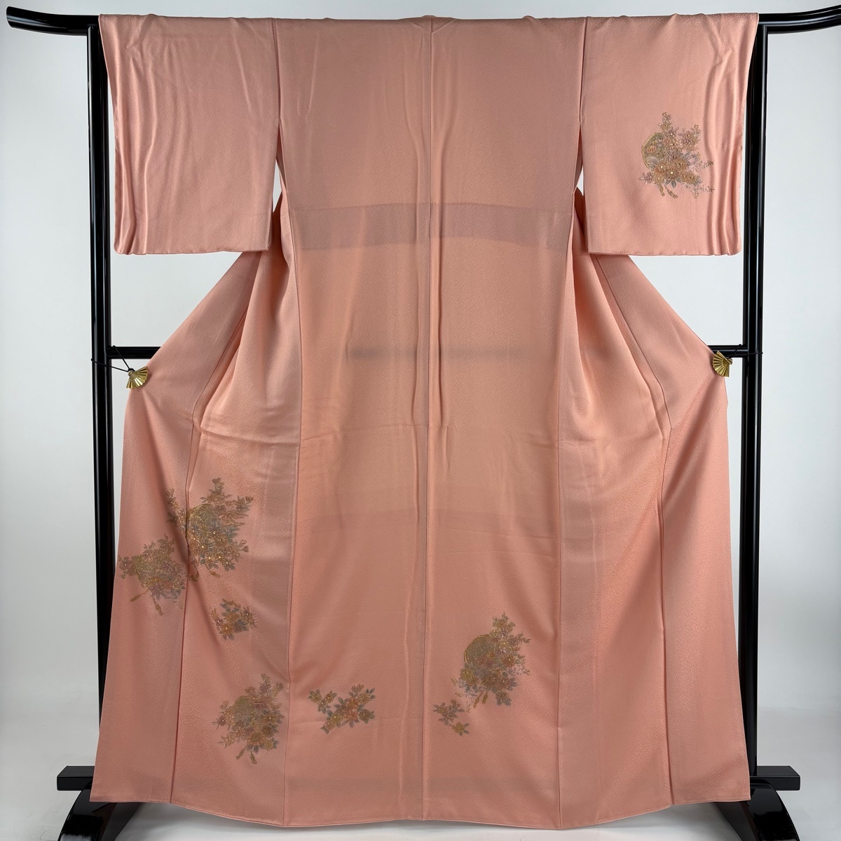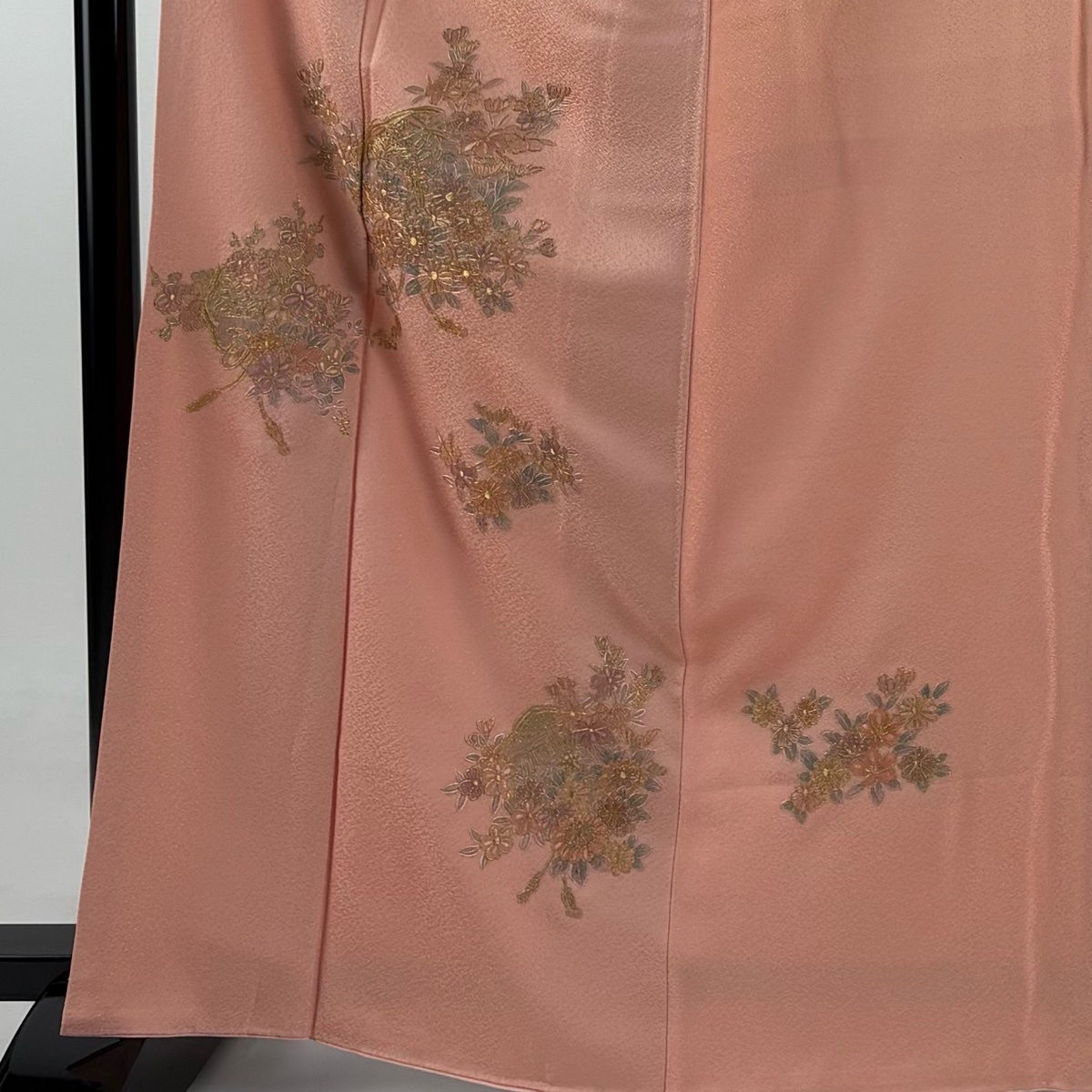 | 付下げ 秀品 鏡裏文 草花 刺繍 金糸 サーモンピンク 袷 身丈165 裄丈64 M 正絹 【中古】 |
