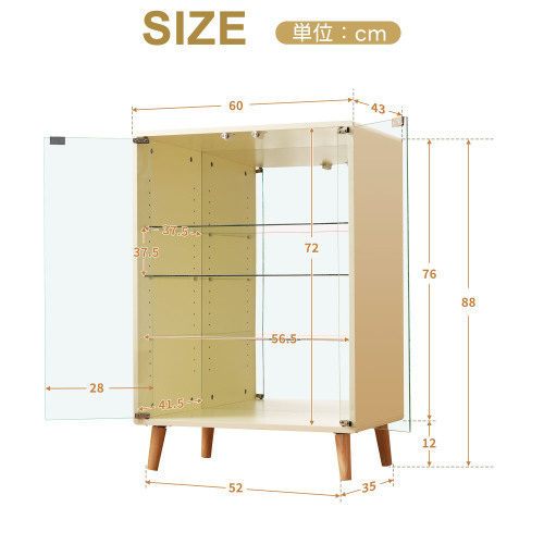 • 【ガラス棚板は高さ調節が可能】飾りたい物のサイズに合わせて、ガラス棚板は約3.2CM間隔で調節をすることが可能です。滑り止め付きのダボでしっかりとガラス棚板を支えます。