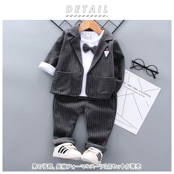 商品説明 | ・男の子用、長袖フォーマルスーツ3点セットが発売。 ・ジャケットはワンボタンタイプ。フロントにミニポケット2つ付き。 ・左胸にあしわられたワッペンがワンポイントに♪ ・トップスはシンプルなロングTシャツにスーツと同じ生地で作られた蝶ネクタイをあしらったデザイン。 ・ボトムスは着脱がラクなウエストゴム仕様。両サイドにポケット付き。 ・伸縮性のある肌触りの良い生地を採用。スーツなのに軽量な着心地。 80cmサイズから110cmサイズまで展開しているから、兄弟でお揃いもかっこいい! |