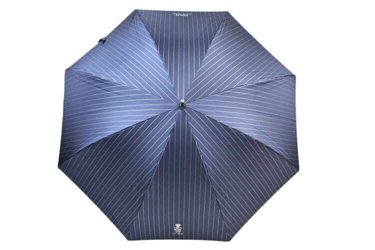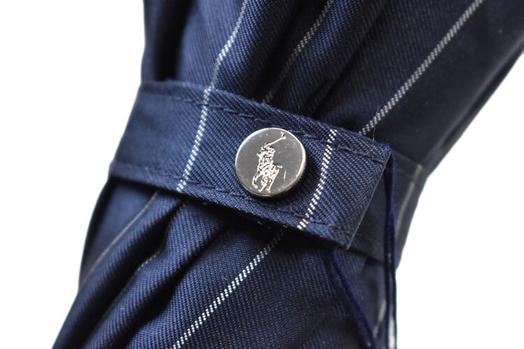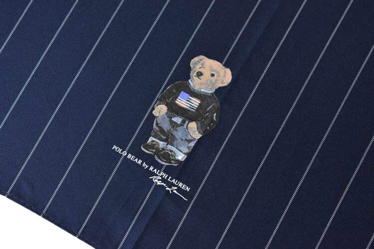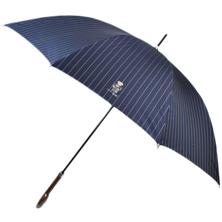 商品説明 | 先染めストライプ ポロベア デザイン 雨傘(長傘)。 指にやさしい安全ロクロ。 色: ネイビー(紺) |