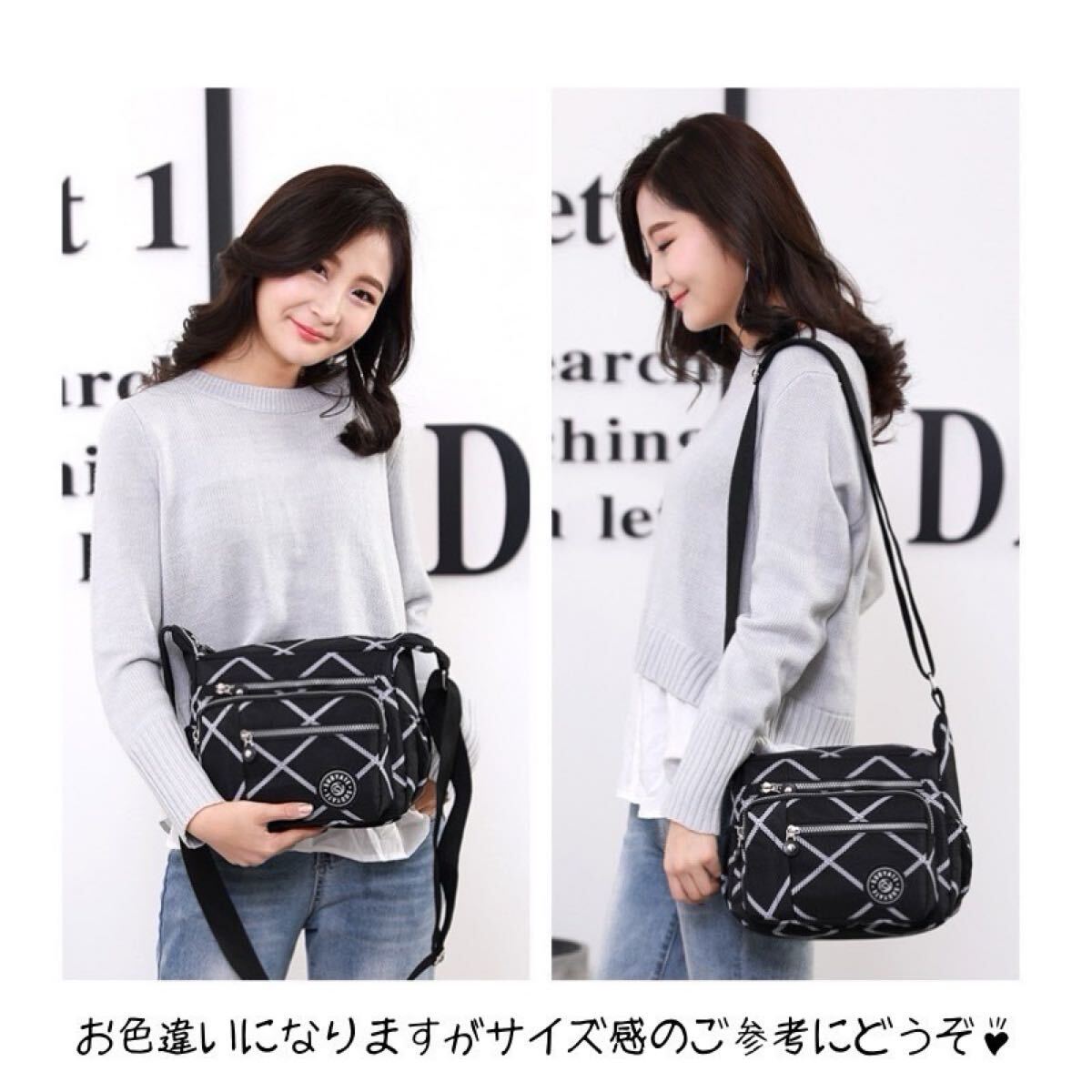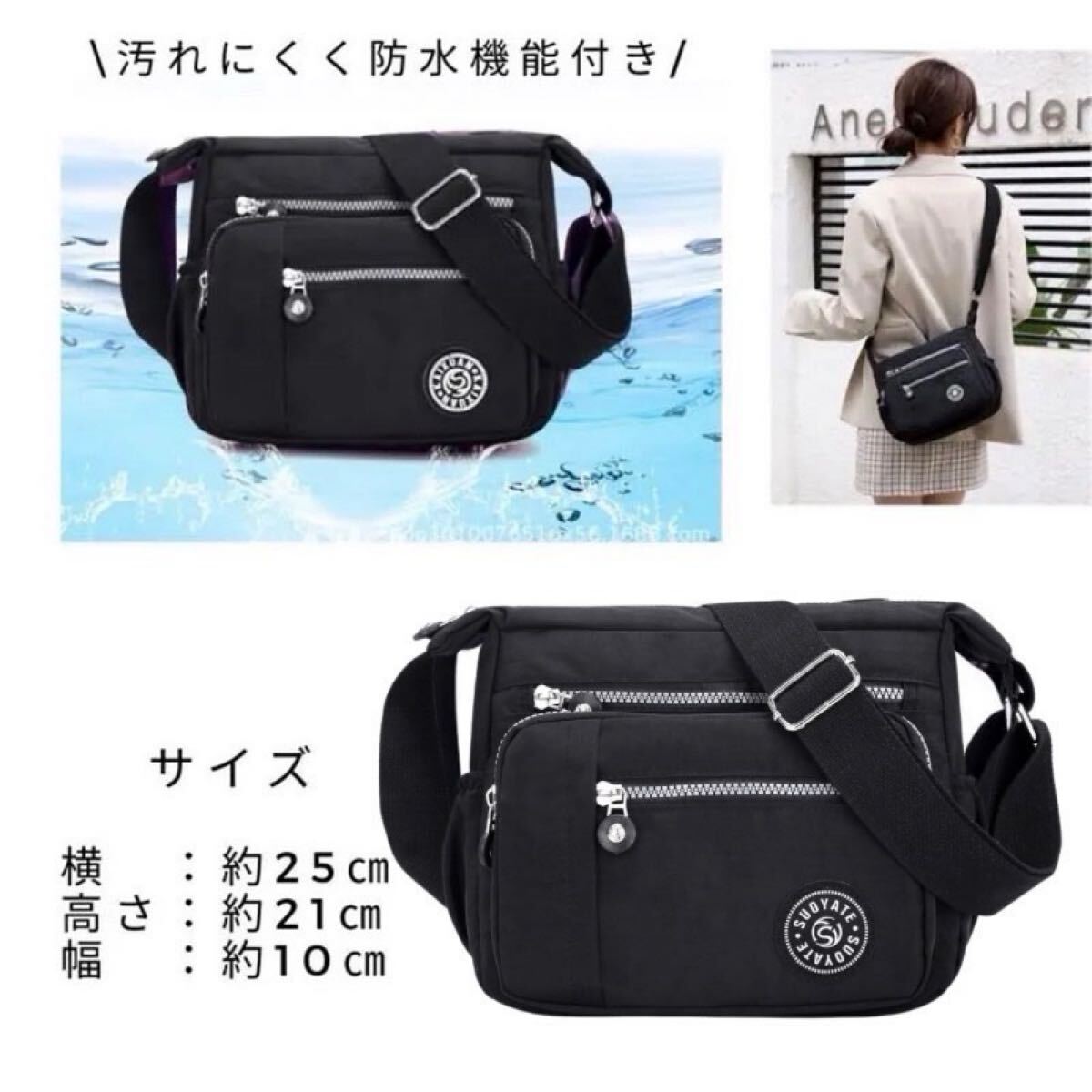 大容量 レディース ナイロン ショルダーバッグ 斜めがけバッグ ポケットたくさん ブラック 黒