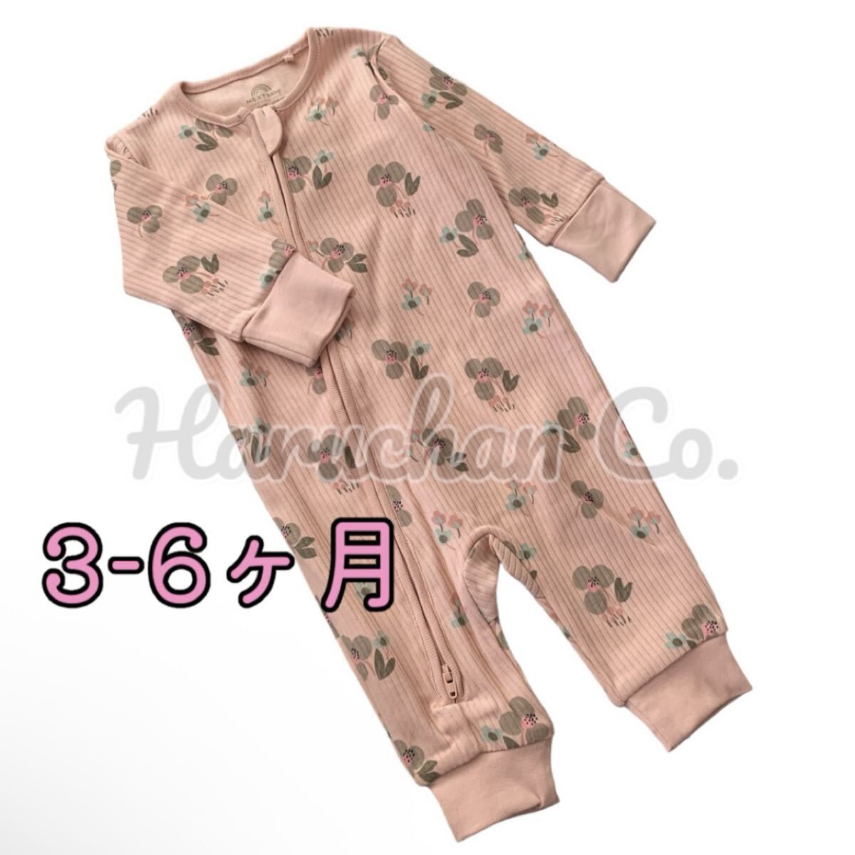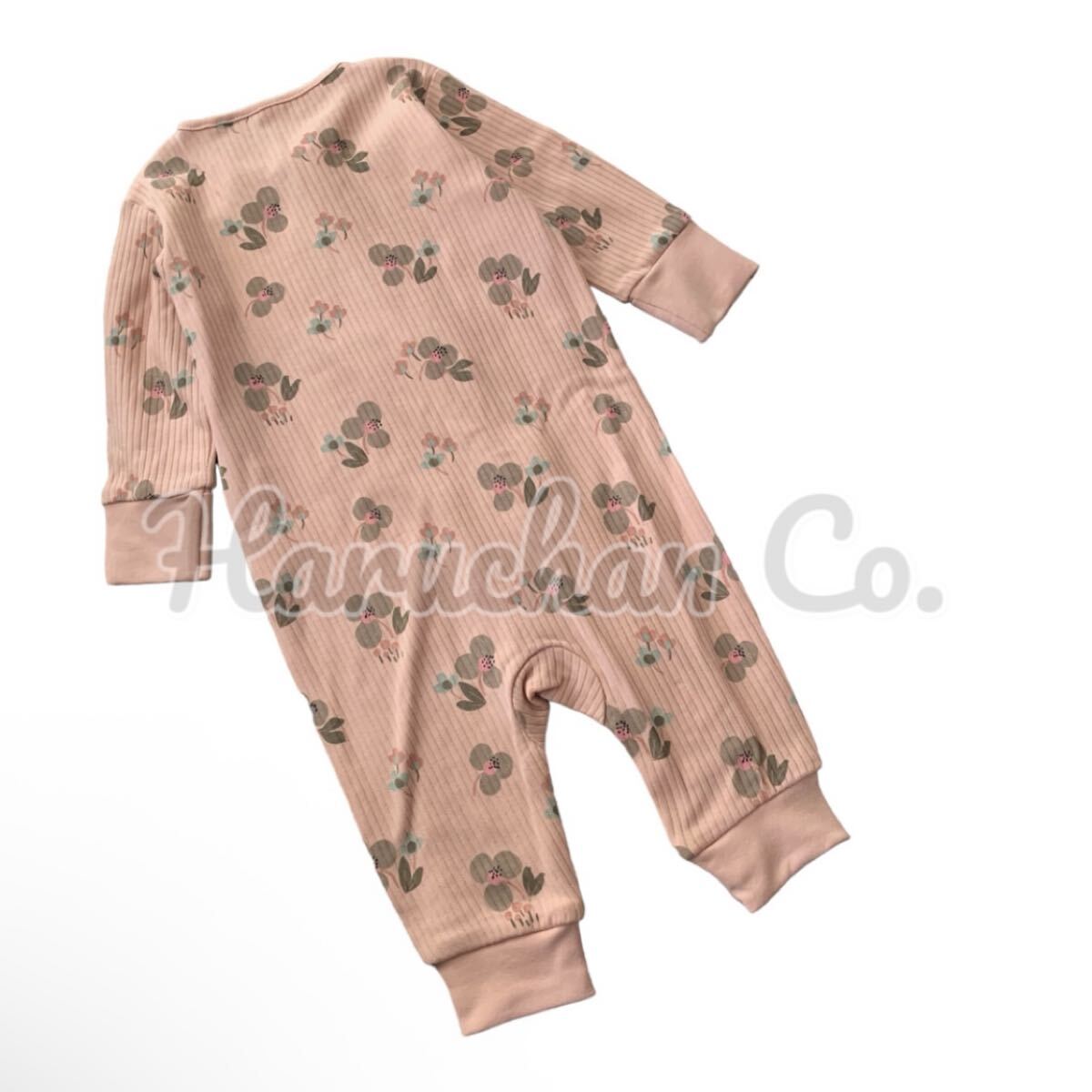 優しいピンク色にかわいい花柄の長袖ロンパース