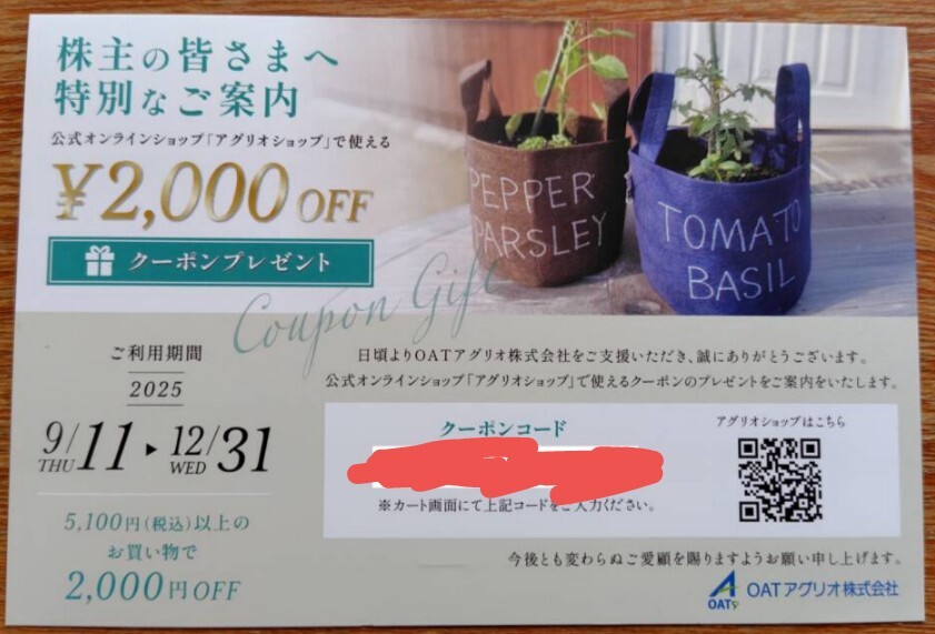 OATアグリオ 2000円OFFクーポン 株主優待 アグリオショップ アグリオショップで使える2000円OFFクーポンです。 5100円以上のお買い物で使用できます。 取引ナビ通知にて送料無料です