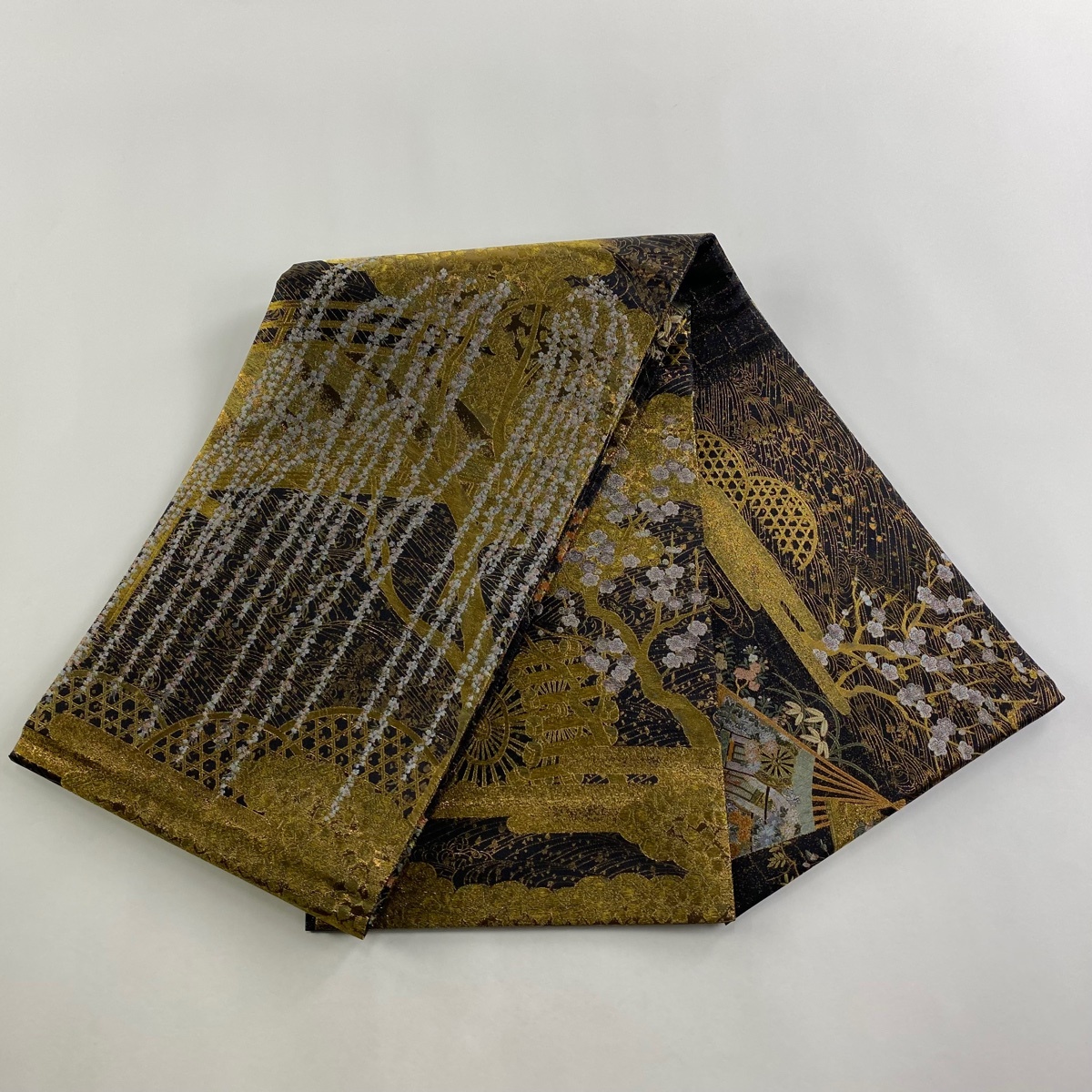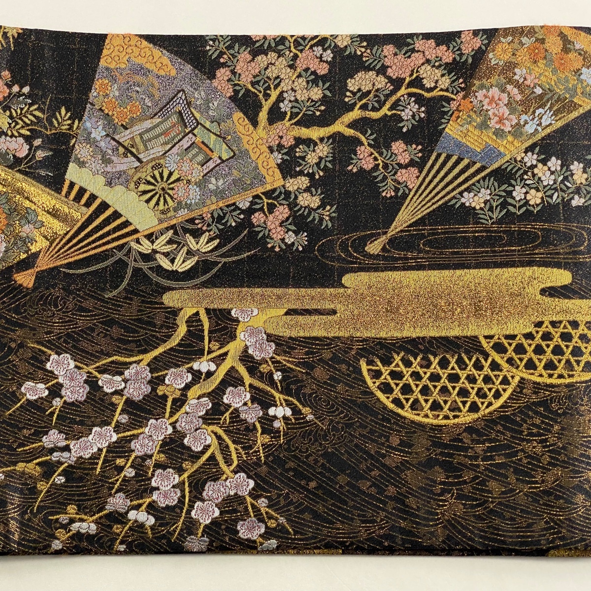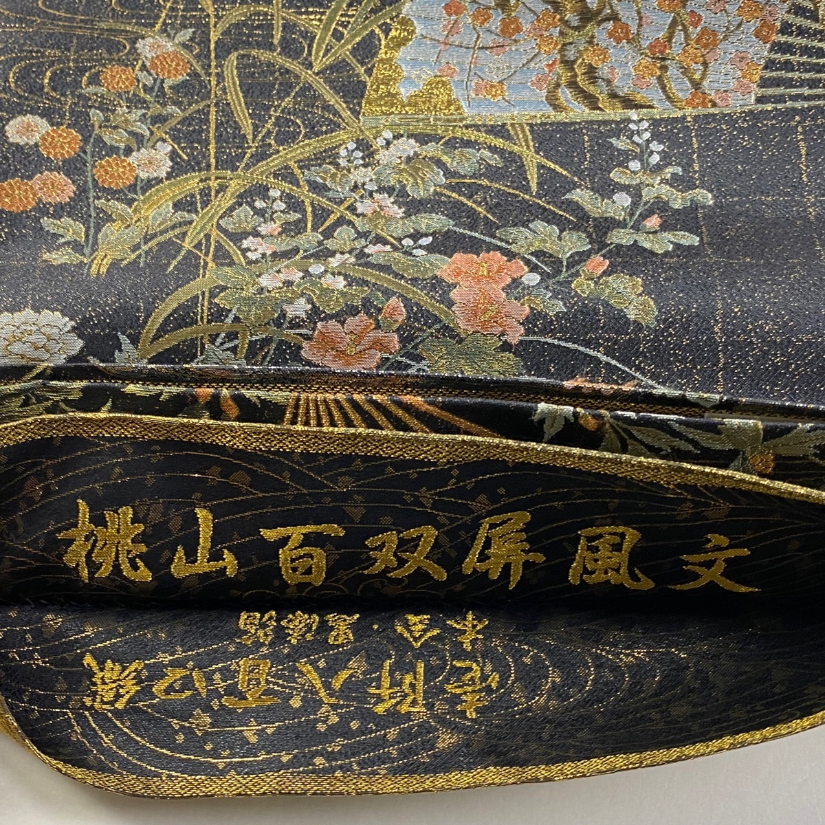 丸帯 美品 逸品 桃山百双屏風文 橋 金糸 箔 墨色 お太鼓柄 正絹 【中古】 |