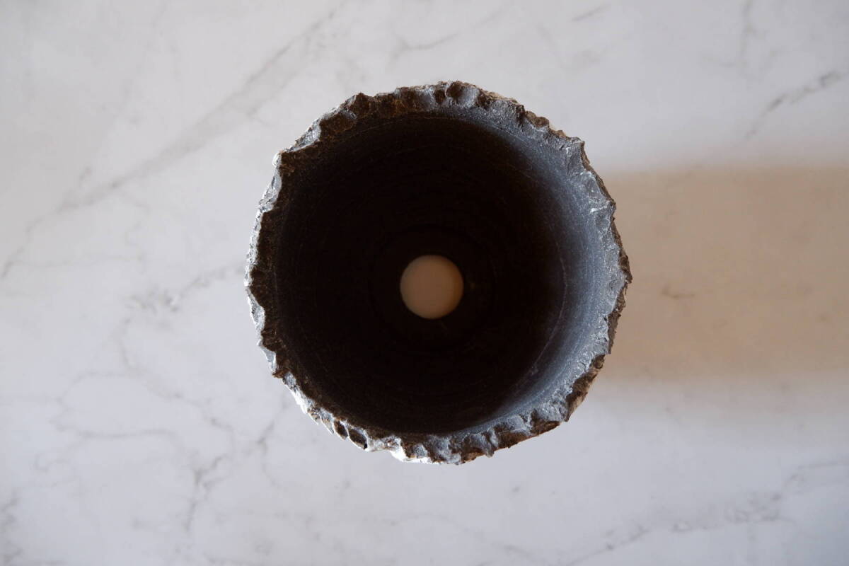 全体を光沢のない極薄の透明釉で仕上げており、表面はザラっとして、黒土の部分は真っ黒より少しグレーがかった発色です。