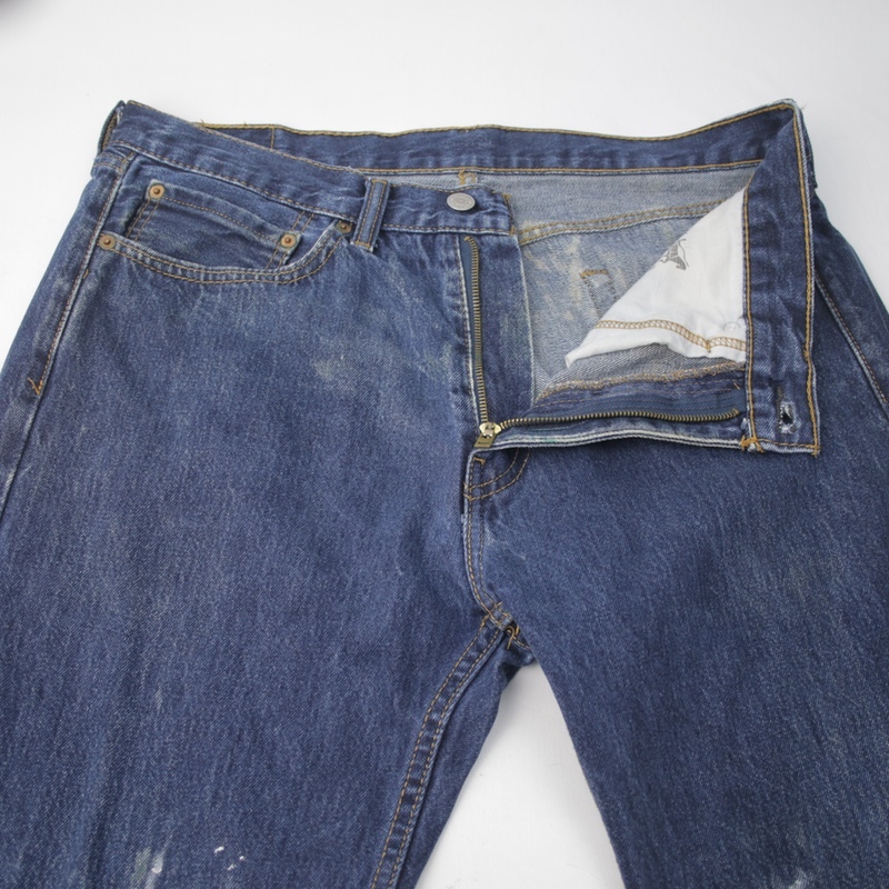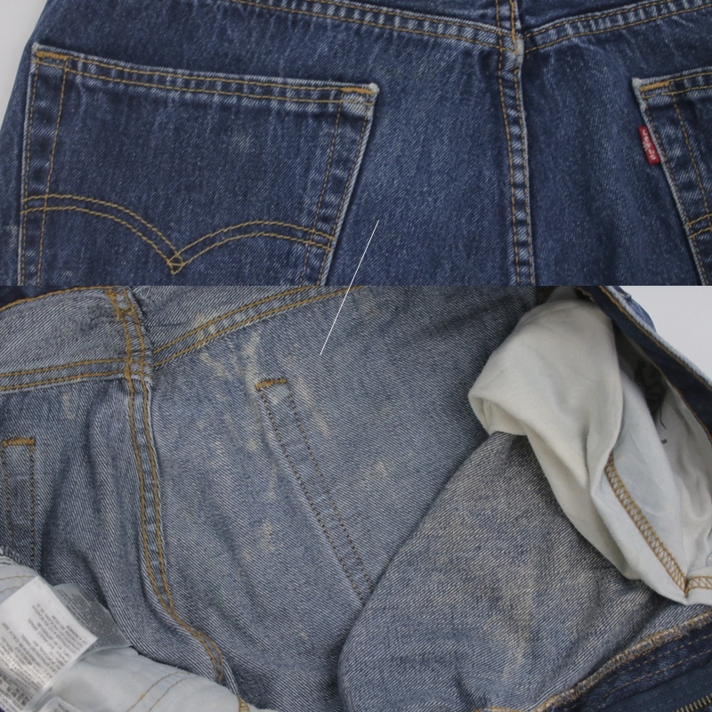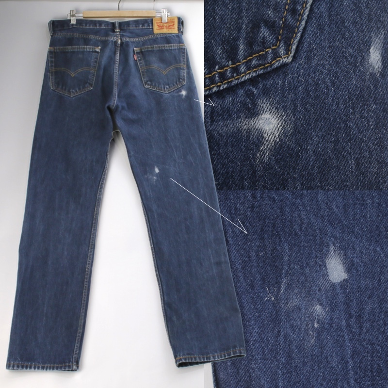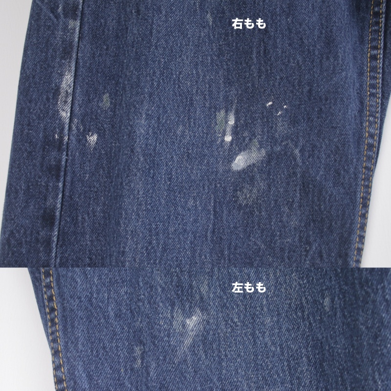 全体的には色濃いめですが、ブリーチ剤のような色落ち、白ペンキなど見られます。