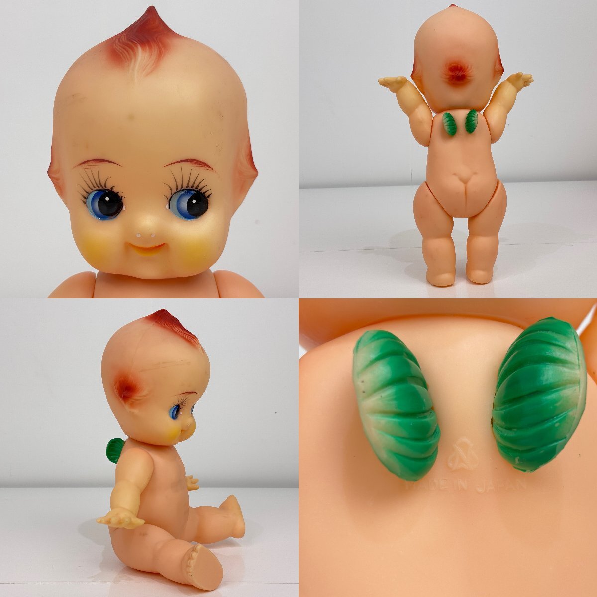 画像2~3枚目のキューピーは緑の羽で、Nのまわりに湾曲した三角のようなマークと、MADE IN JAPANと刻印されています。