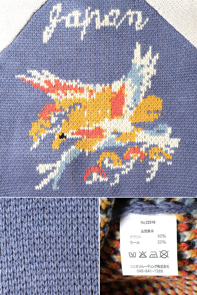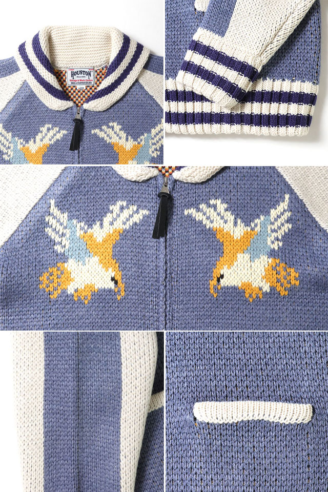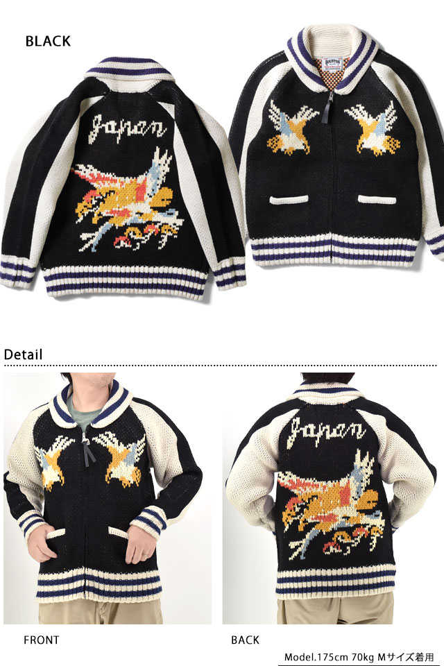 日本で初めてオリジナルのフライトジャケットを生み出し、その後も数々の国内製ミリタリー商品を製造する「ヒューストン」から、カウチンニットセーター「HAWK」(22316)のご紹介です。 HOUSTONが得意とするスカジャンを、カウチンニットに落とし込んだカーディガンです。 スカジャンをモチーフにしたカウチンセーターシリーズはHOUSTONならではの解釈をもとに実現されたアイテム。 2025年は鷲柄をリリースしました。 フロントはジップアップ仕様。 両身頃にはポケットが縫い付けられています。 | ||||||||||||||||