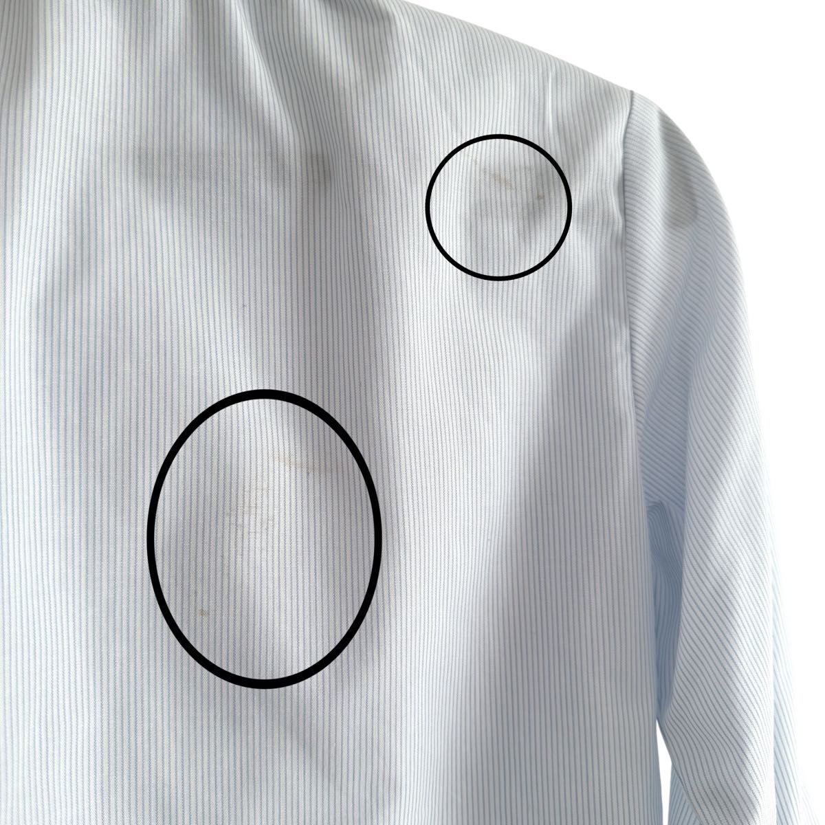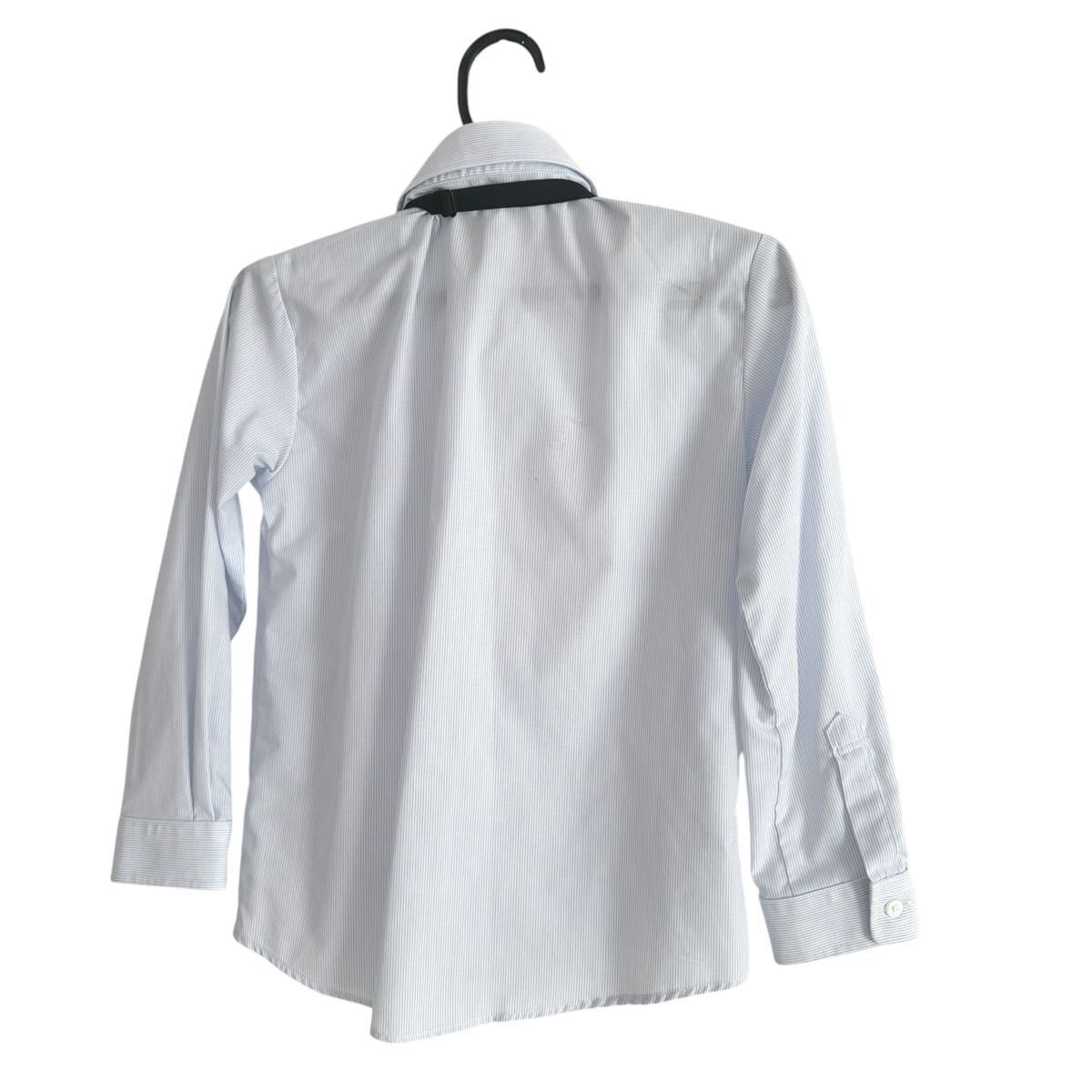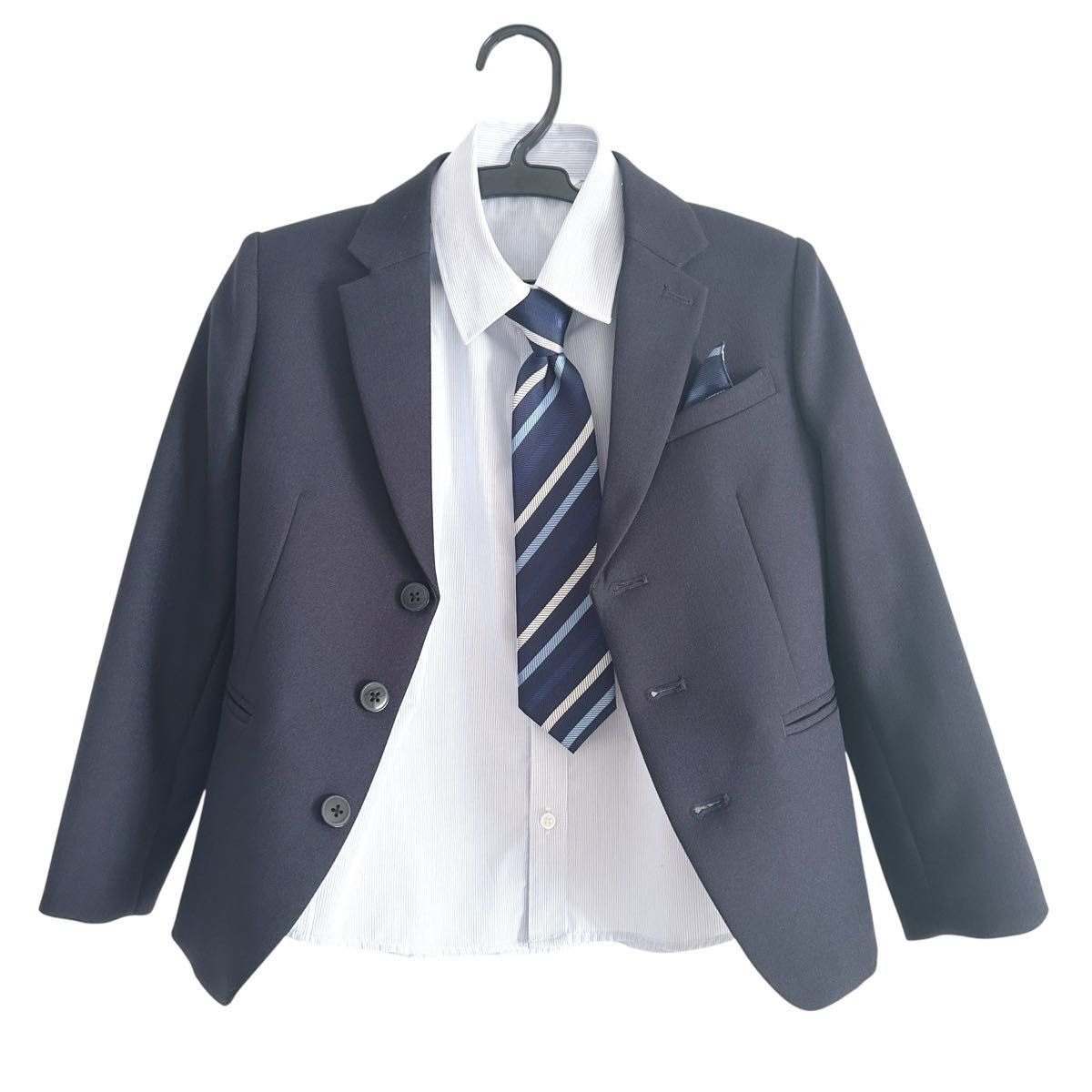 2年前に購入し、2度短時間着用。サイズアウトのため出品します。ジャケットの色は黒です。色あせはありません。ワイシャツはブルーのストライプになります。ワイシャツの後ろ側に薄いシミがありますので、お安く出品させていただきます。