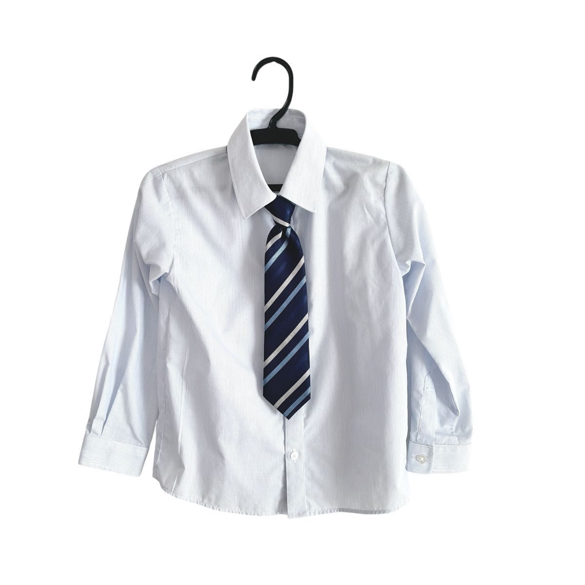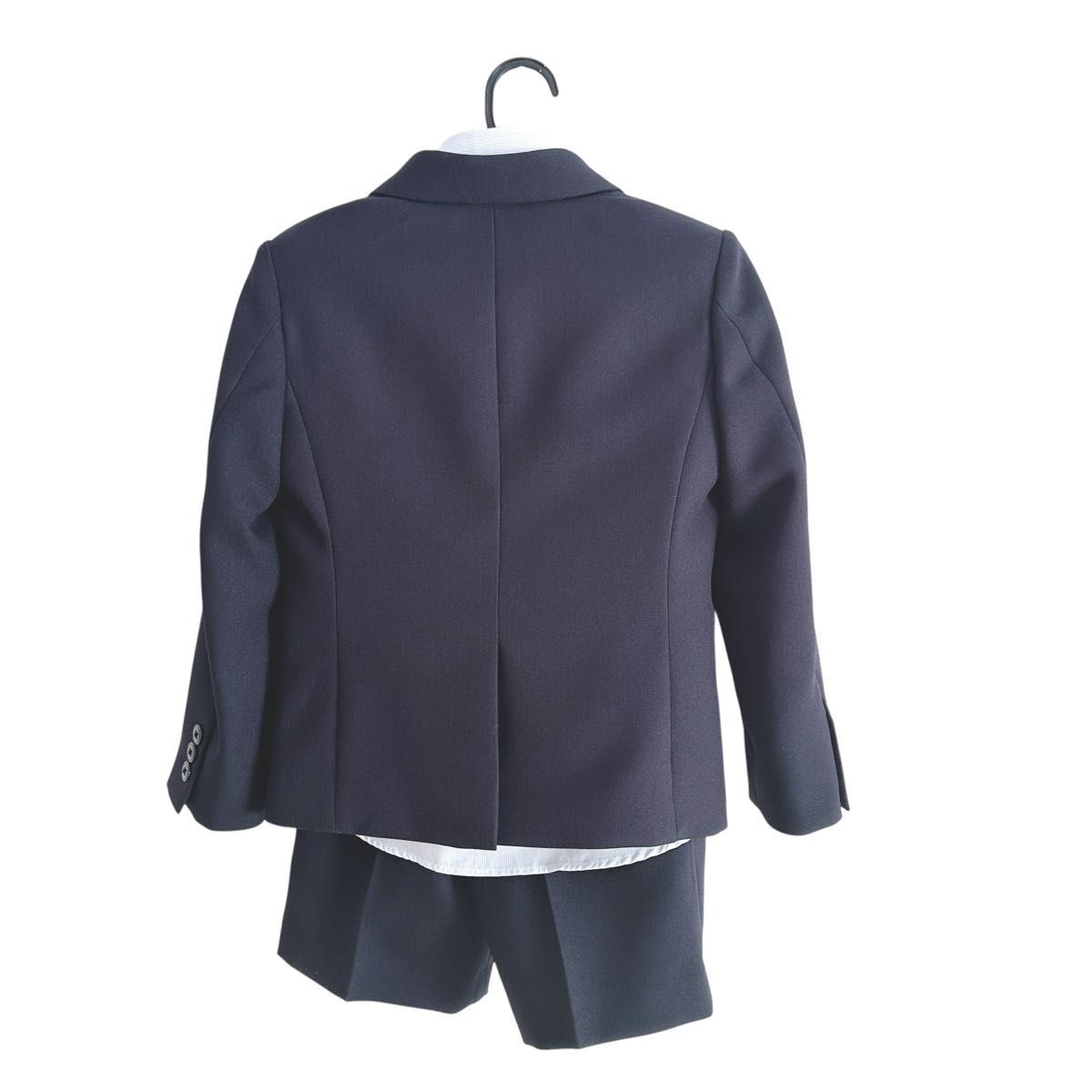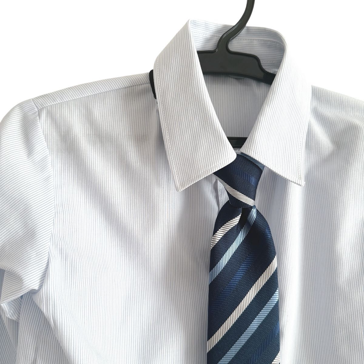 2年前に購入し、2度短時間着用。サイズアウトのため出品します。ジャケットの色は黒です。色あせはありません。ワイシャツはブルーのストライプになります。ワイシャツの後ろ側に薄いシミがありますので、お安く出品させていただきます。