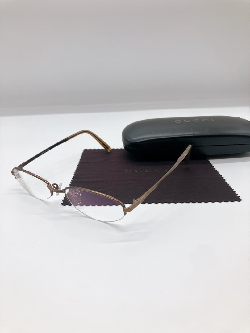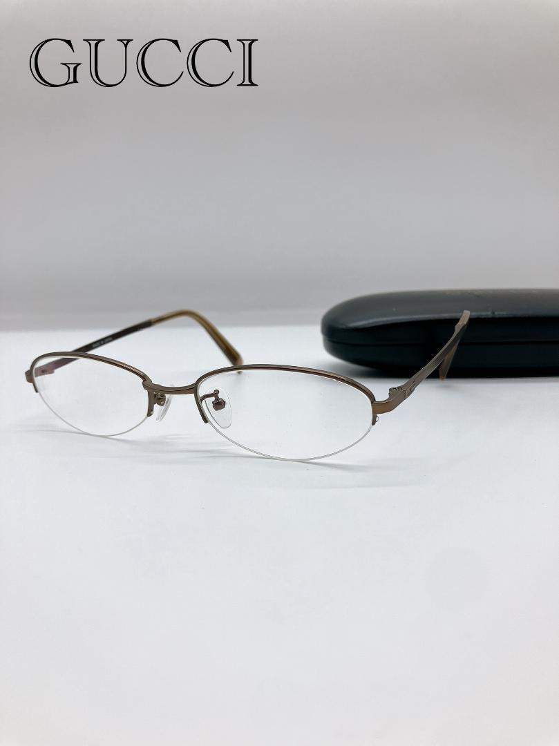 GUCCIのブラウンオーバルフレームメガネ、ケース付き。