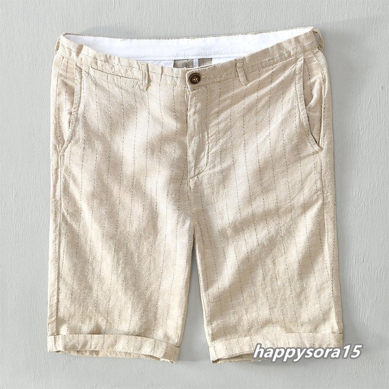 ショートパンツ メンズ ハーフパンツ  リネンパンツ 綿麻 ショーツ  短パン ストライプ柄 薄手 着心地抜群 カーキ 34