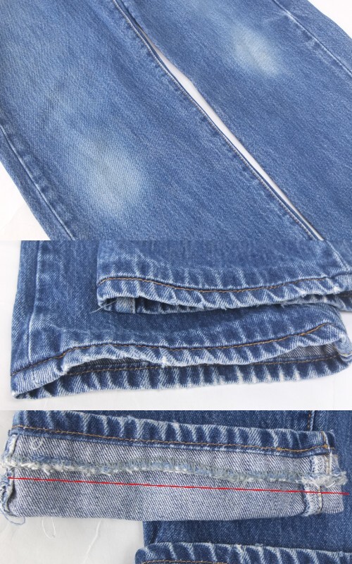 すそ上げされていますが、すそのあたり、色落ちを生かしたのか、表側オレンジステッチのすぐ上に切り替えと裏側すそから3cmぐらいの所につまんだ縫い跡。その部分折り返しになっているので、厚みがあります。
