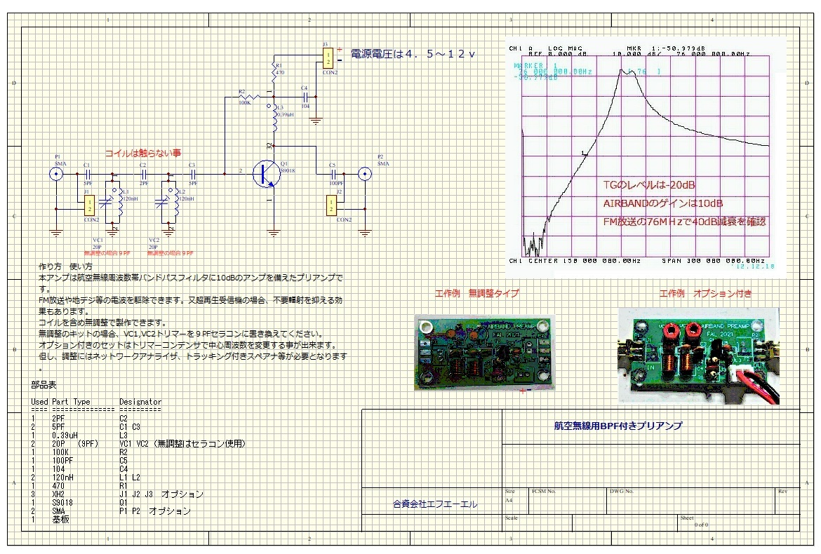 航空無線専用バンドパスフィルタ付きプリアンプ基板キットです。