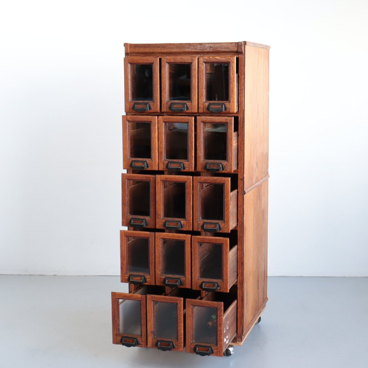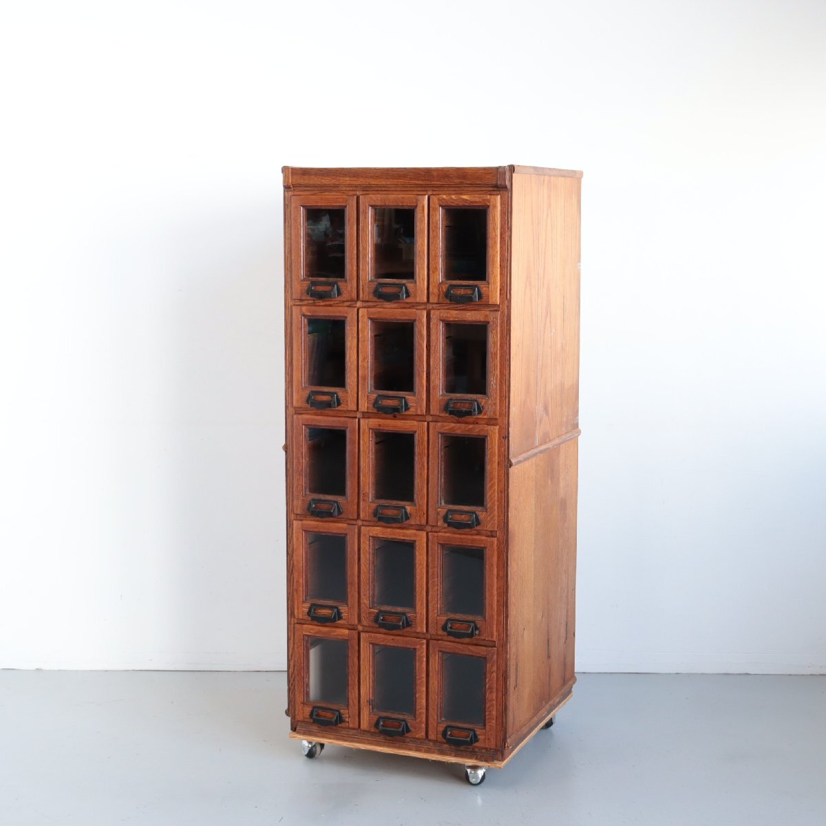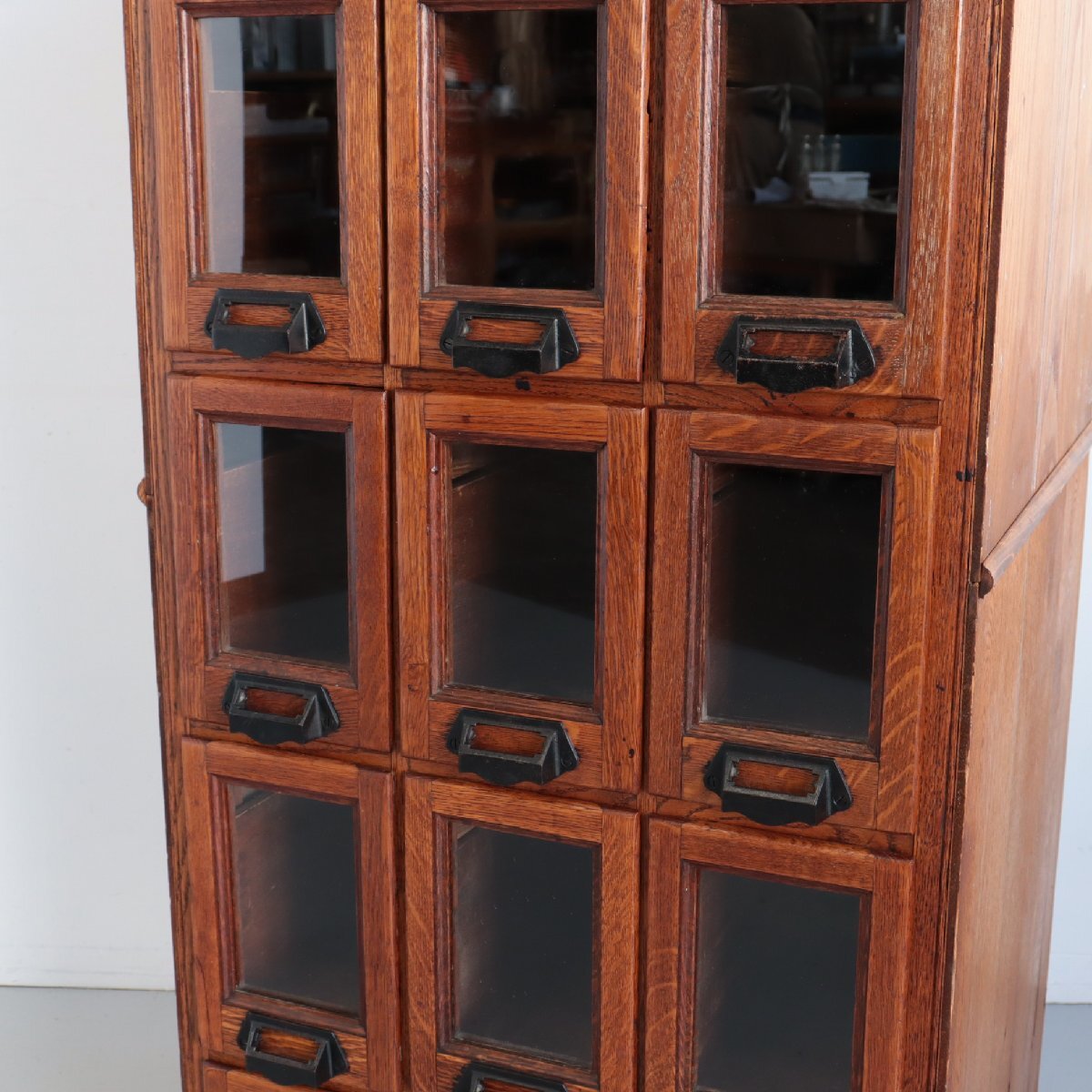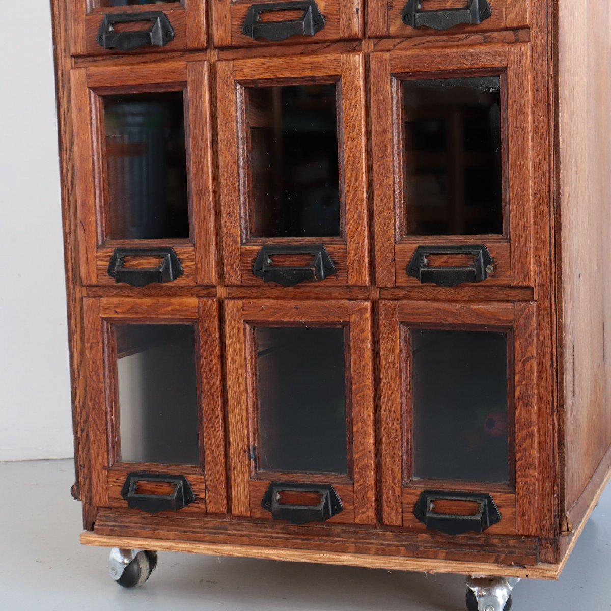 商品説明 explanation | 推定1920年~1930年頃のディスプレイキャビネットです。 当時、ショップでお菓子のディスプレイ・販売に使われていたモノのようです。 この年代特有の、荒々しさのあるオーク材の木目は重厚感があり、非常に良い雰囲気です。 ご自宅や店舗什器にいかがでしょうか。 ※台車に載せて撮影しています。 ※ガラスは反射よって黒く見えますが、透明です。 |