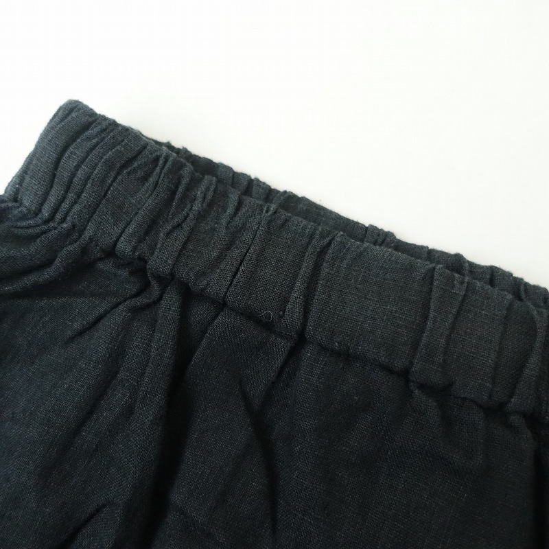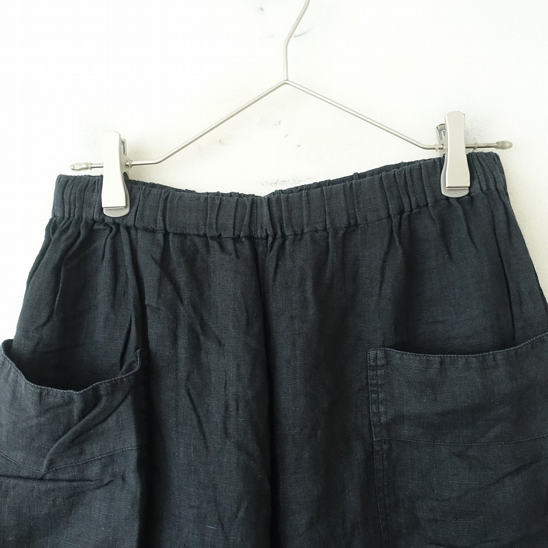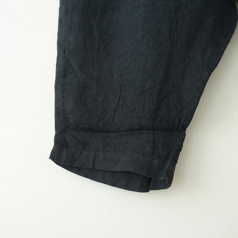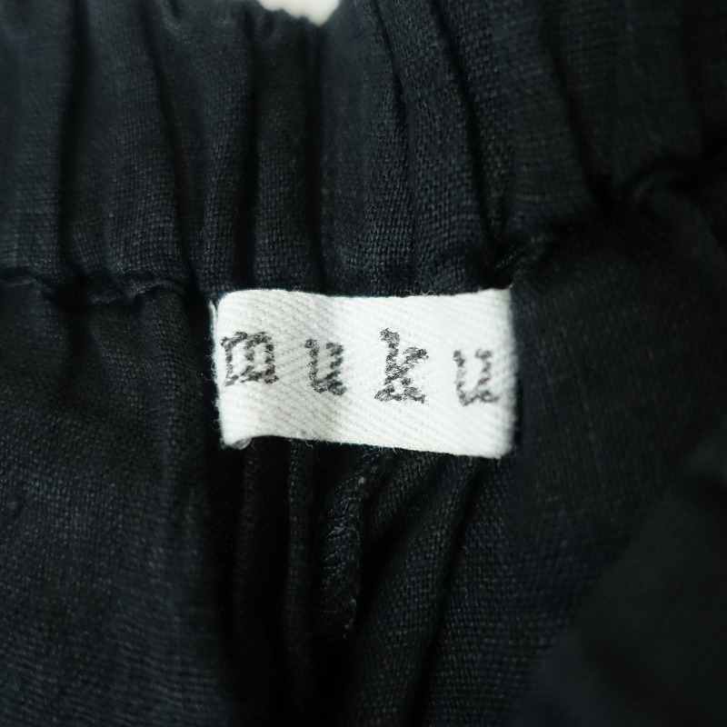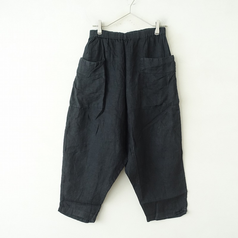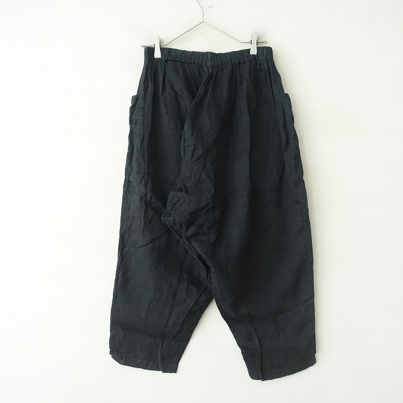mukuのリネンイージーサルエルパンツです。カラーはブラックで薄手リネン地で仕立てられております。ウエストは総ゴムで、股上の深いサルエル型のテーパードシルエットになっております。両サイドに大きめのパッチポケットが付いております。 |