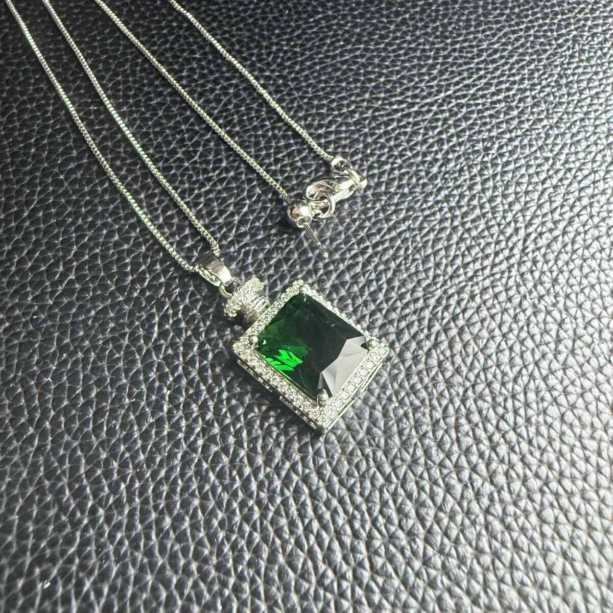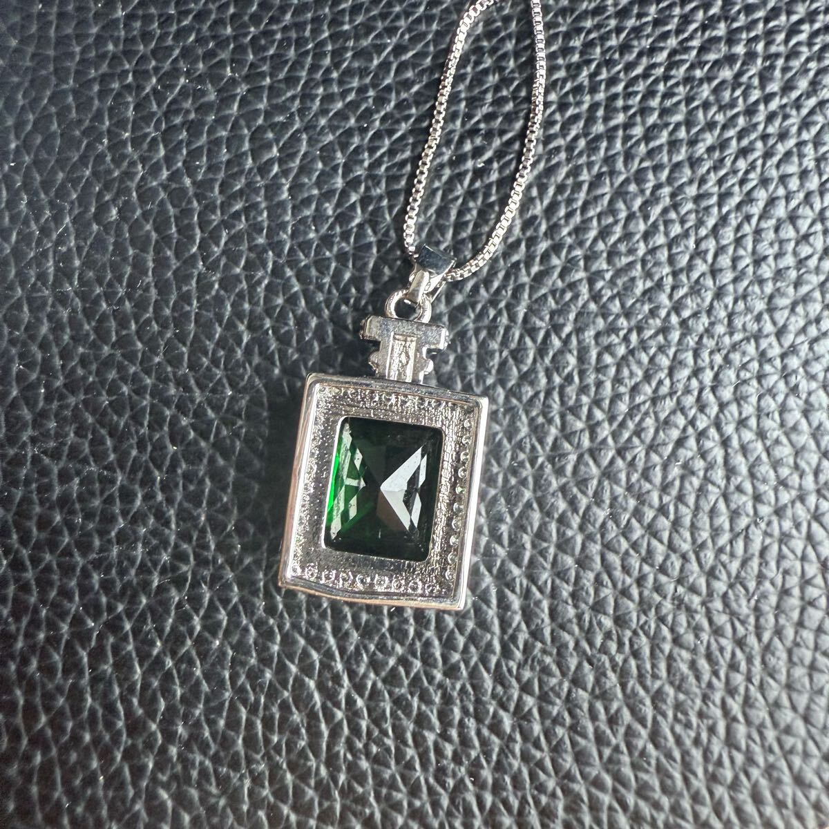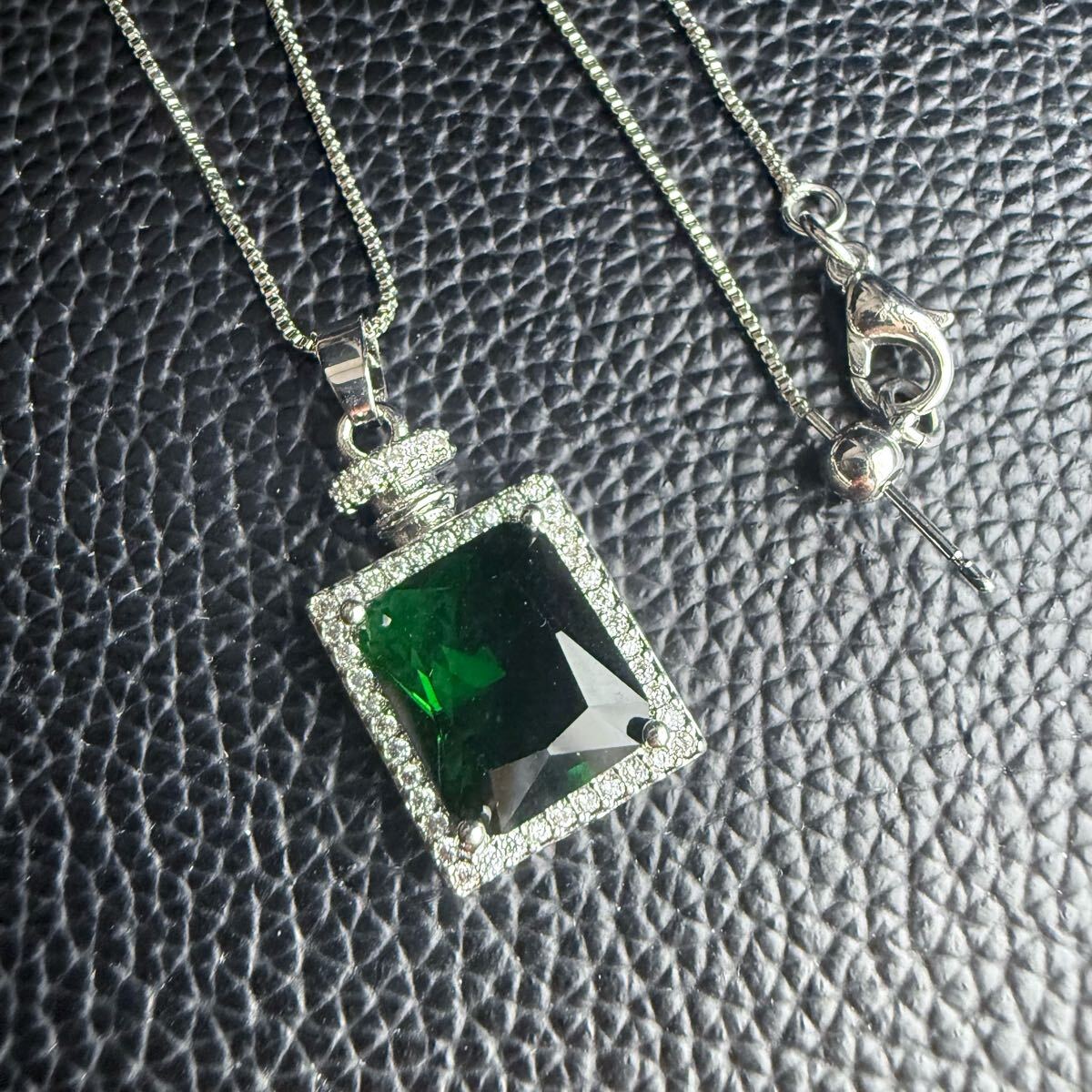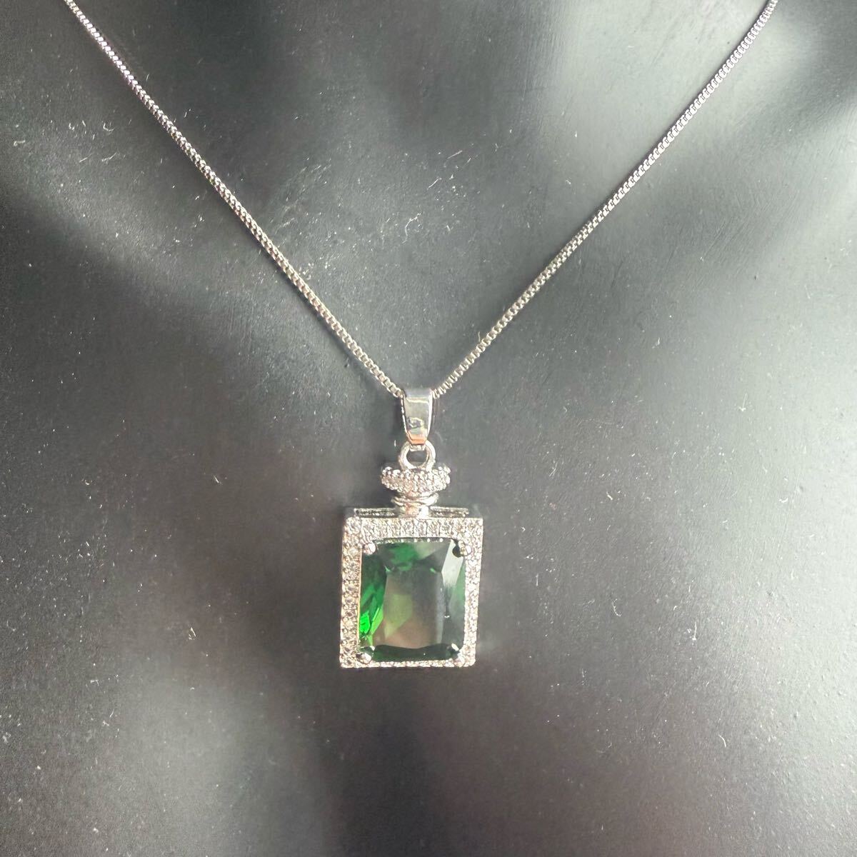 鮮やかな緑色の水晶(約12×10×6mm)をカットし、香水瓶をイメージした枠にセッティングしたペンダントです。透明感のある深緑はエレガントで落ち着いた印象を与え、煌めくキュービックジルコニアが上品な輝きをプラスします。