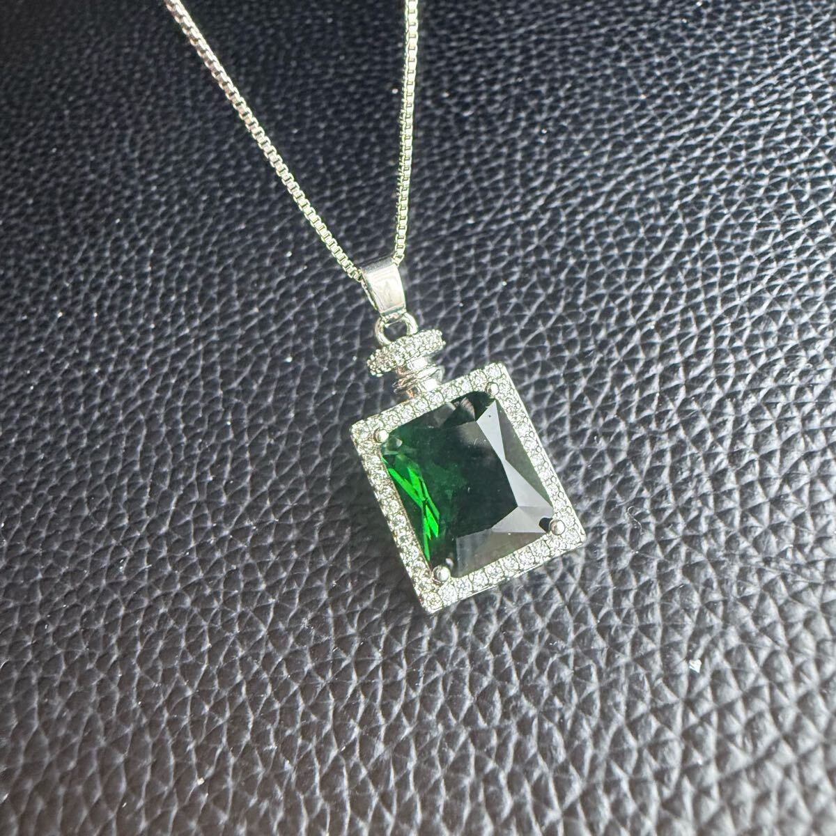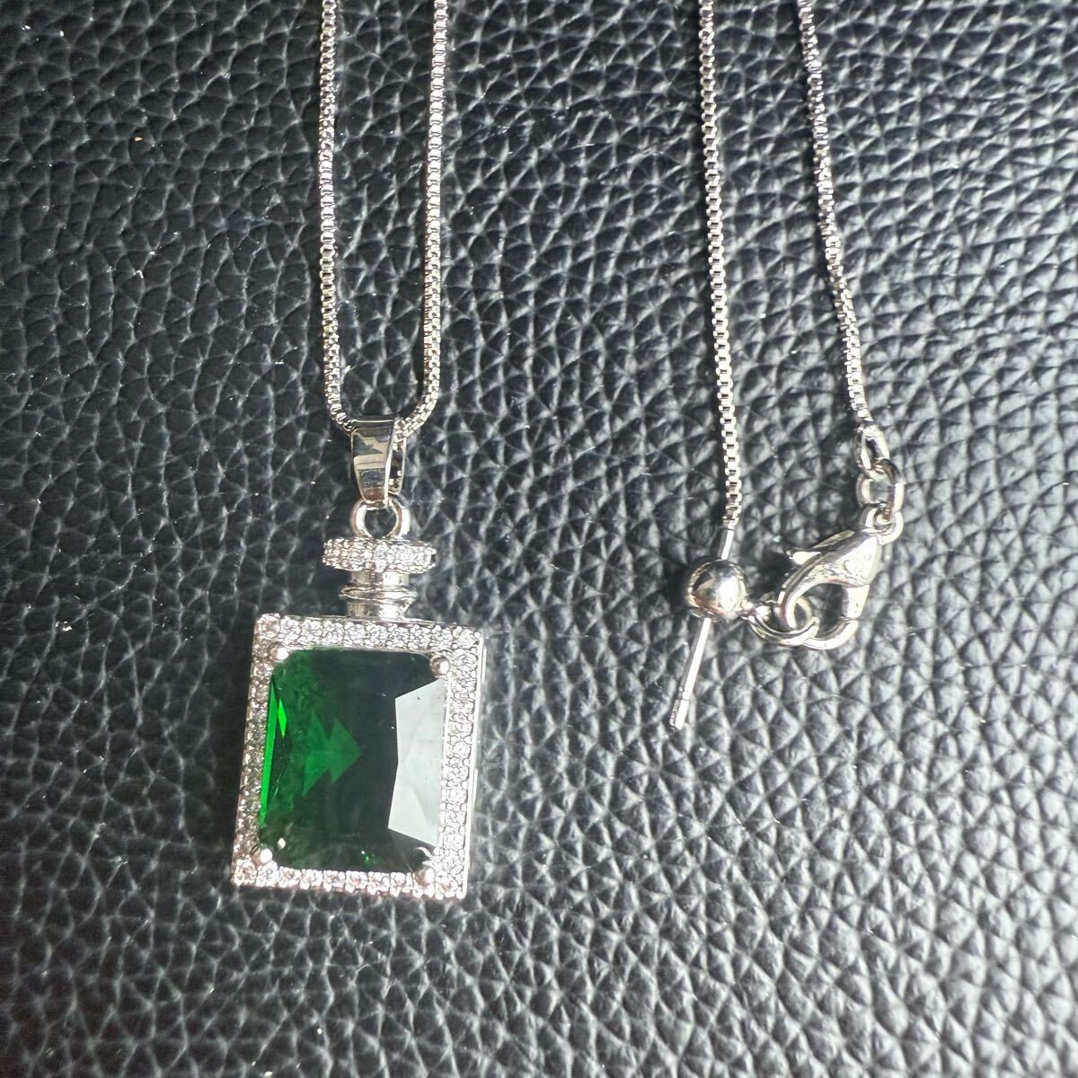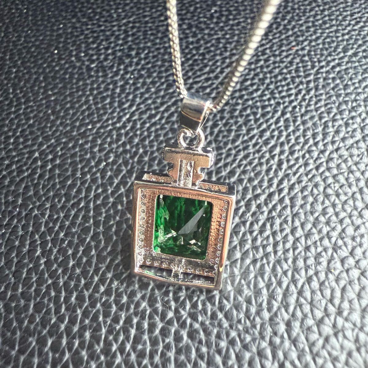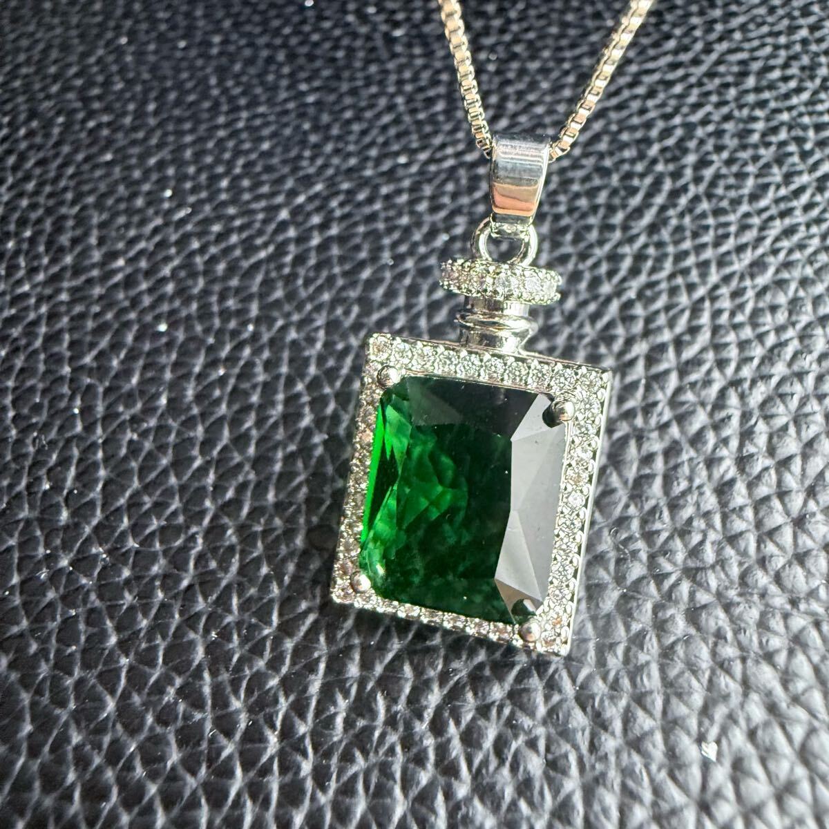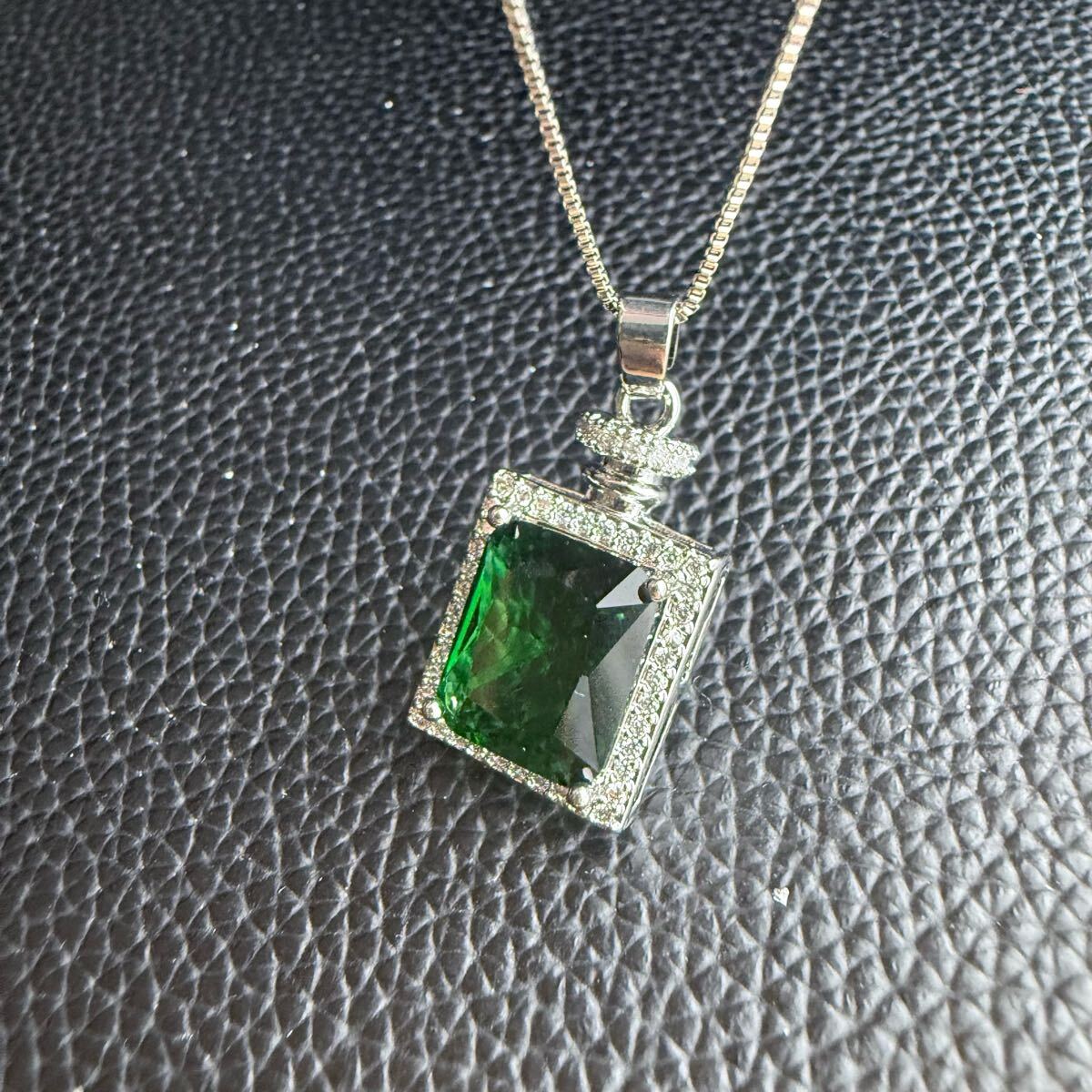 鮮やかな緑色の水晶(約12×10×6mm)をカットし、香水瓶をイメージした枠にセッティングしたペンダントです。透明感のある深緑はエレガントで落ち着いた印象を与え、煌めくキュービックジルコニアが上品な輝きをプラスします。