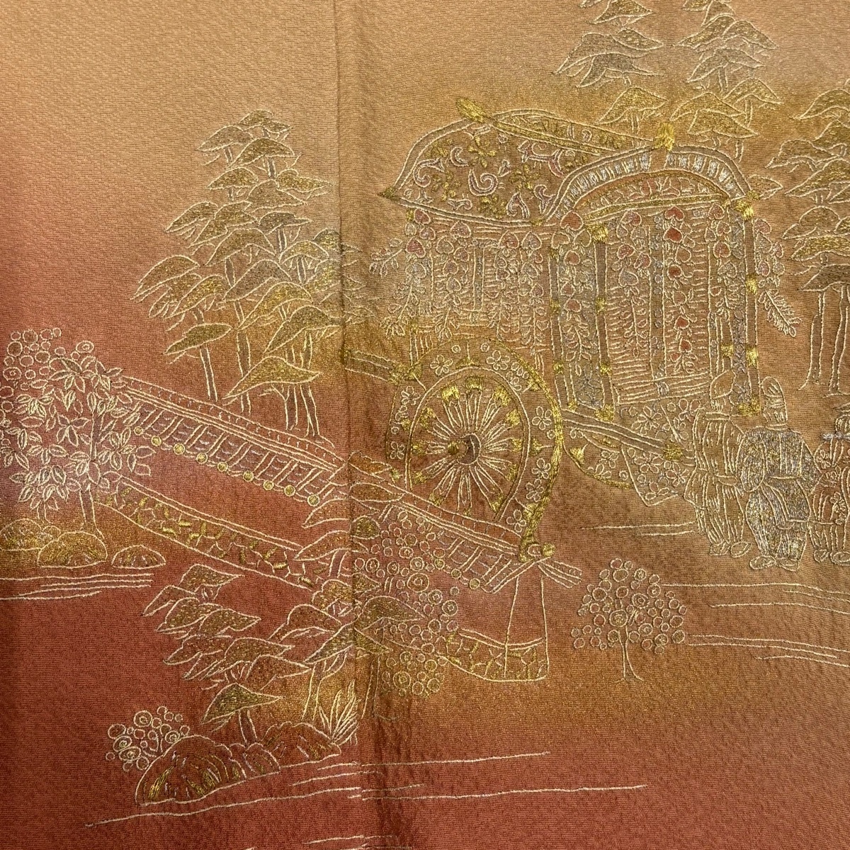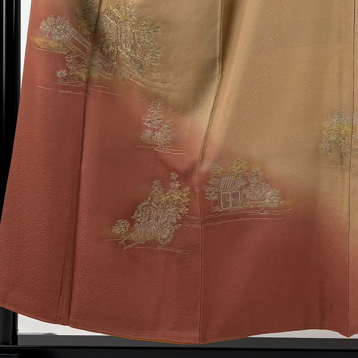 | 付下げ 美品 秀品 御所車 人物 金糸 金彩 茶色 袷 身丈157.5 裄丈62.5 S 正絹 【中古】 |