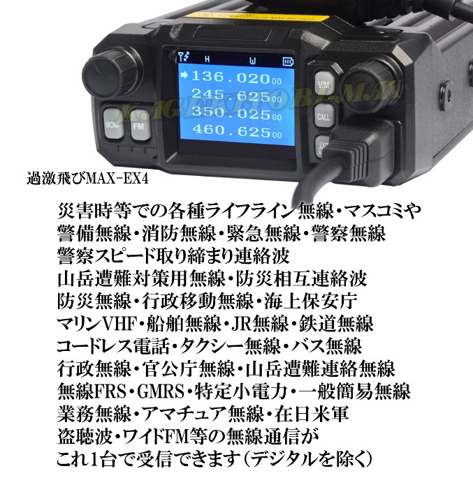 【EX4】V/U帯 4バンド同時受信可能 Jなし ワイド送受信♪12V用シガライター付 車載型 無線機 新品 過激飛びMAX /モービル機 FM&ワイドFM