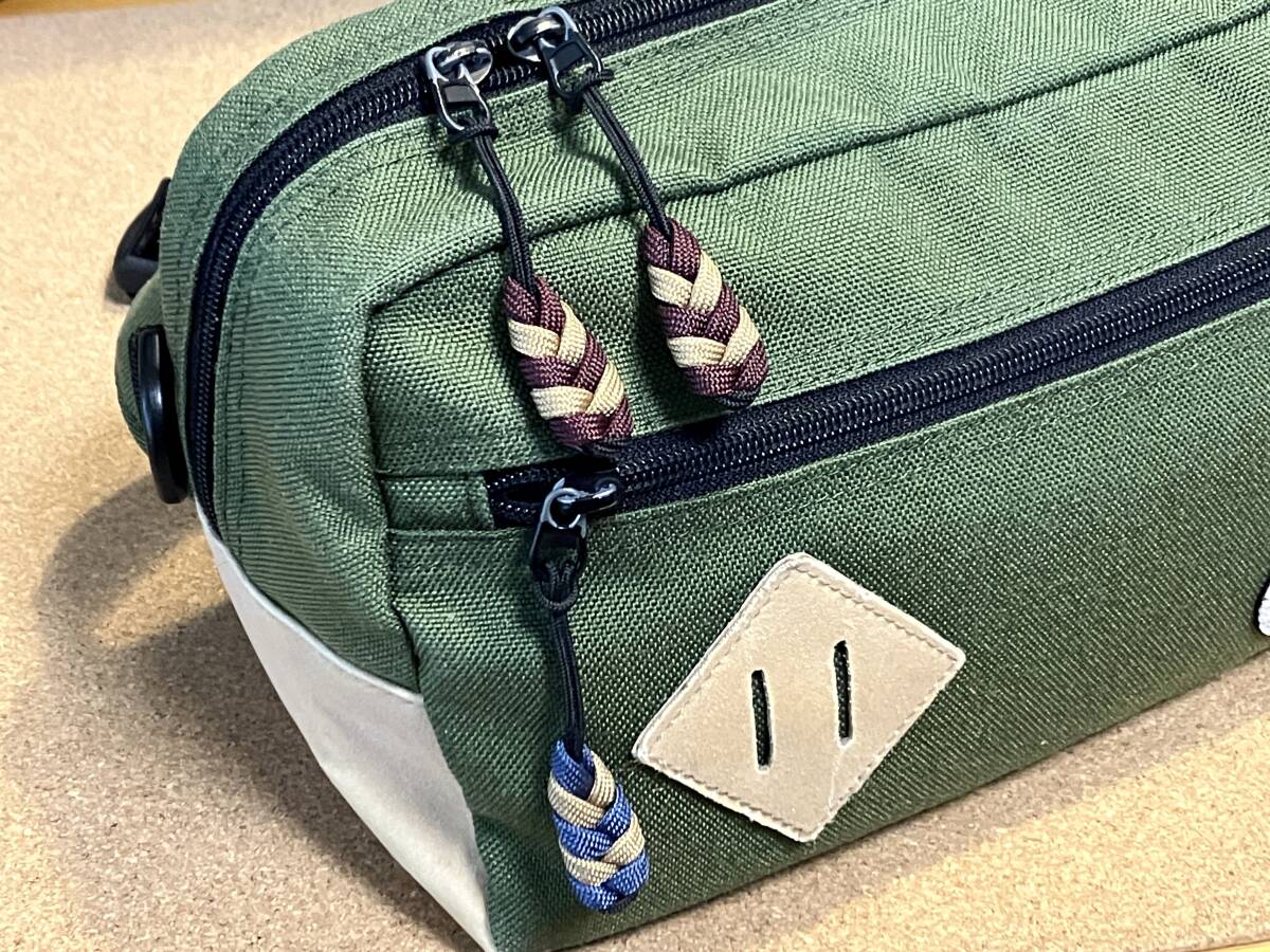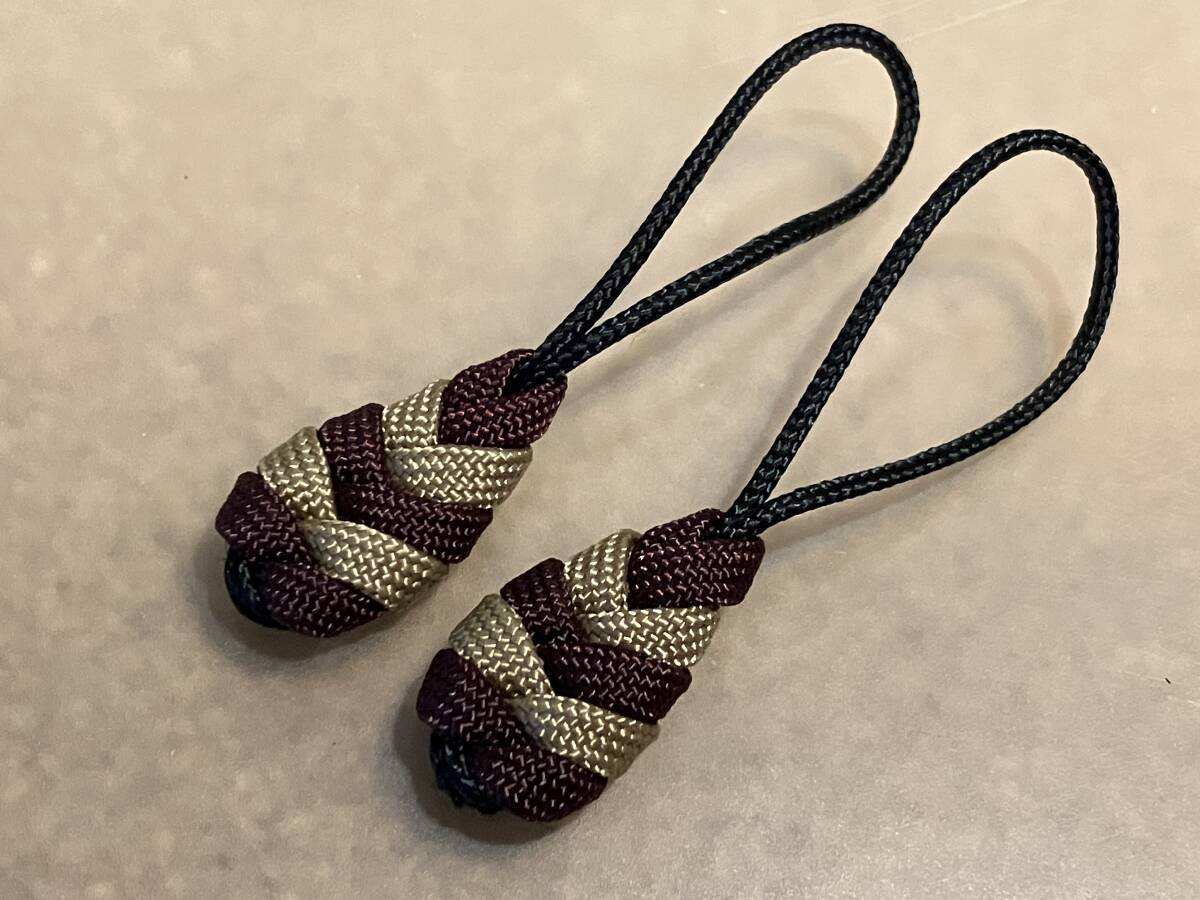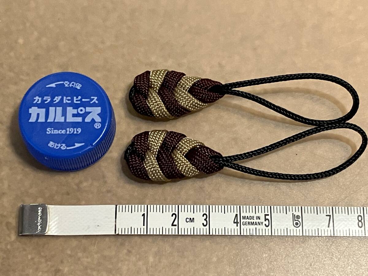 通常のパラコード製ジッパータブは、軸線と巻線が同一の太さで作られたものが多いですが、これは軸紐に細めの紐を使用した、月寅次郎のオリジナル品です。