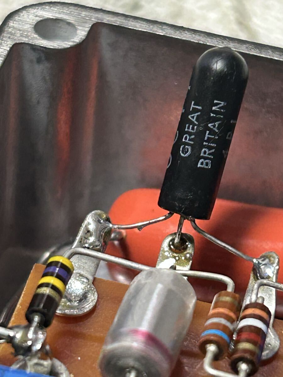 | 商品紹介 | HAND MADE トレブルブースター OC44(Mullard製Black Glass)仕様 になります。 60年代RANGEMASTER(レンジマスター)の回路を元に製作いたしました。 オリジナルと同じトランジスタを使用しておりますので、本物の音が欲しい方にはお勧めです! 仕様 ・ゲルマニウムトランジスタOC44(Mullard製Black Glass)を使用 ・ラグ板にPtoPにて配線 ・抵抗は50年代AB製、コンデンサーは60年代製や現行品を選別して使用 ・配線は現行オーディオグレード品を使用 ・ケースはハモンド製焼付塗装品を使用 ・ハンダは60年代KESTER44を使用 ・ON/OFFのLED付き ・回路は本物同様にポジティブ・グランドで組み込んであります。 ・FATスイッチによりミッドブースターとしても使用できます 今回製作したブースターはレンジマスターの回路を元に超希少なOC44を使用した1石ブースターになります。 音色はゲルマニウム特有の分厚いトーンです。 お使い頂くとレジェンドギターリストが使用してきた理由がわかりますよ! YouTubeにサンプル音源をアップしましたので、参考にして下さい。 『sample』 ゲルマニウムトランジスタOC44について… このゲルマニウムトランジスタですが、50年代ころから60年代くらいまで製造されておりました。 ヨーロッパのパーツメーカー数社で製造しておりましたので、製造メーカーによって多少の違いがあるようです。 今回使用しているトランジスタはMullard製ガラス封印タイプでかなり入手困難なパーツになっております。 注意点として、高いところから落とさない事、高温の場所に置かない事です。 特に温度管理が重要です。 真夏の車の中や、暖房器具の吹き出し口、直射日光の当たる場所などに置かないようにしてください。 以上の点を十分注意していただければ、末長くご使用できますので、ご安心ください。 使用電池について… エフェクターで使用する電池はアルカリが多いと思いますが、このブースターはマンガン電池をご使用ください。 OC44の耐久性にも影響しますし、トーンも違います。 |