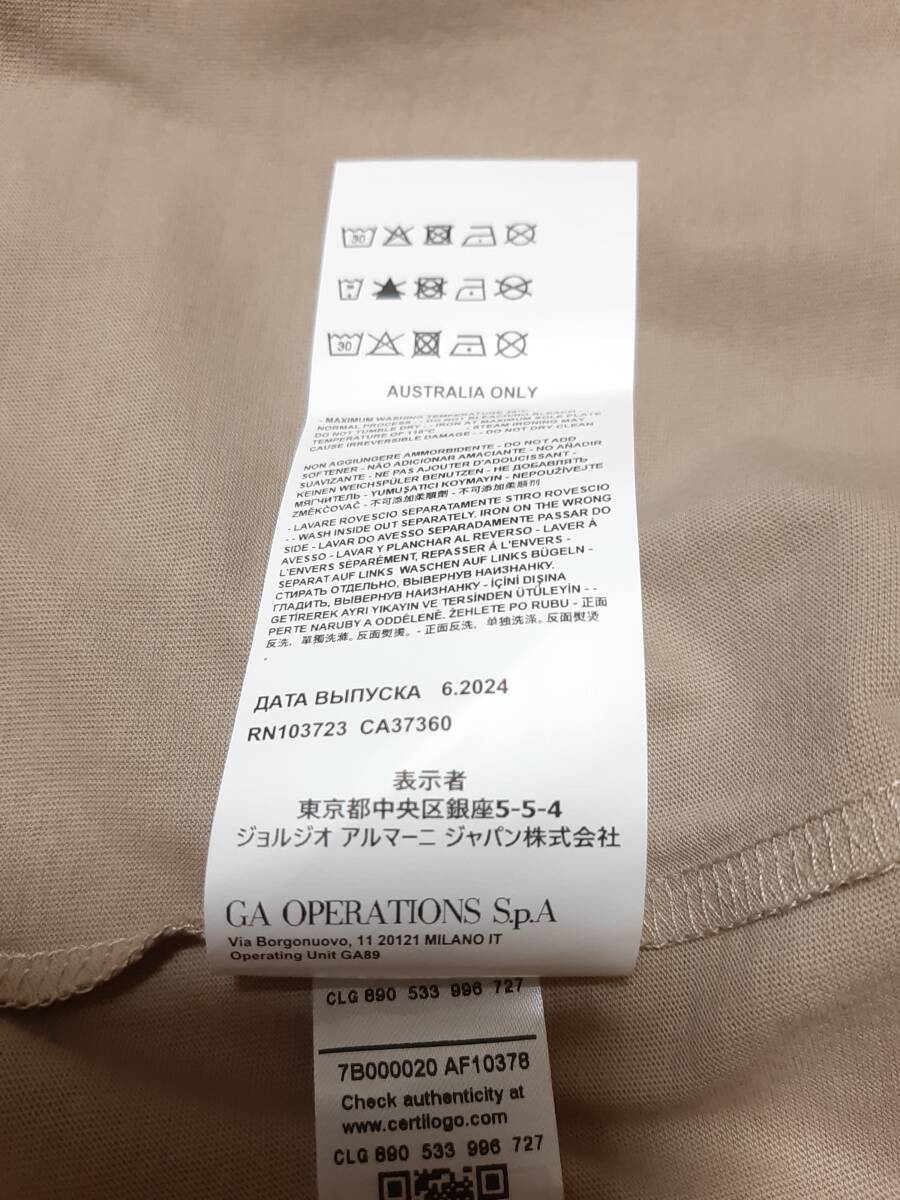 現在は並行輸入品でも、服の内部に付いた品質表示のタグには日本語で、【表示者 ジョルジオ アルマーニ ジャパン株式会社】と記されていることを理解しておいてください。また、輸入元の海外は日本ほど商品の扱いが丁寧ではありません。生地に若干のスレなどがある場合があり、目立つものは記しますが、目立たないものに関しては記しませんので、完璧な商品をお求めな方は正規店をご利用ください。