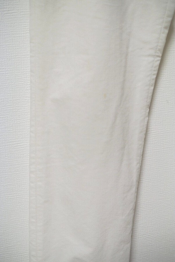 使用感も少なく全体的には美品だと思いますが、残念ながら右足付け根部分と膝付近にかなり薄いシミがございます。(画像②③)