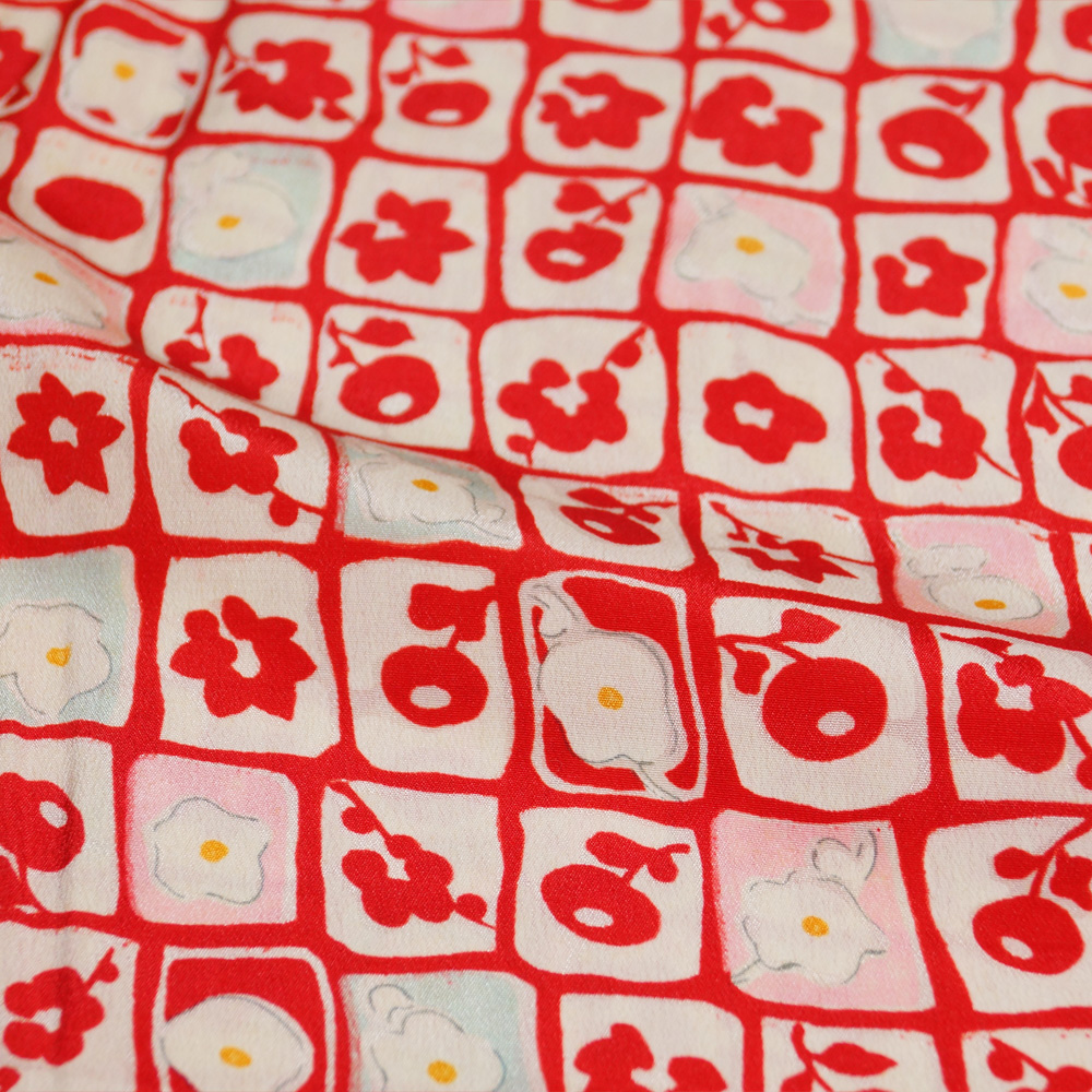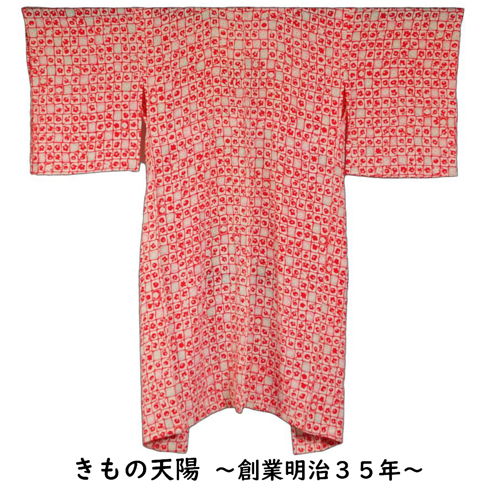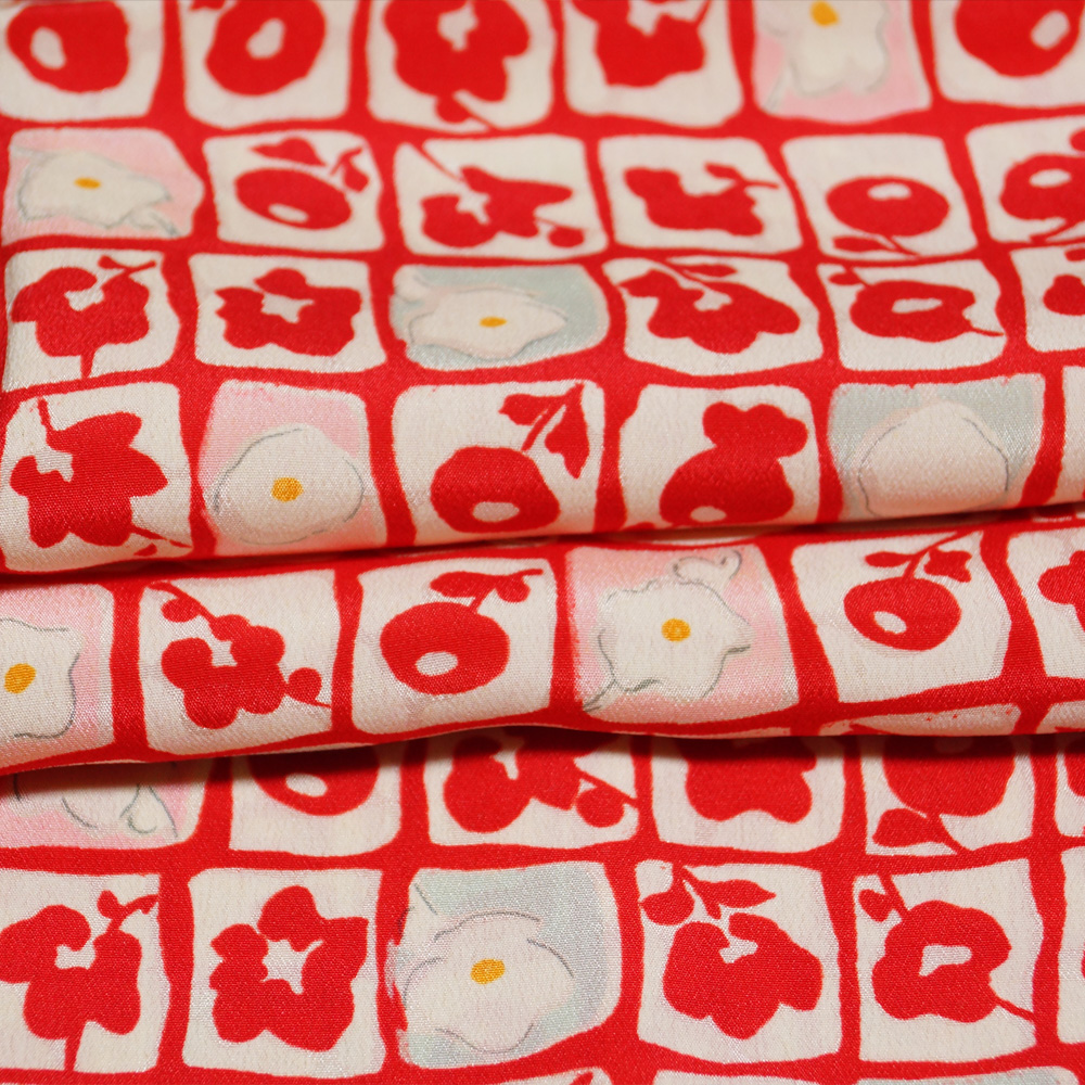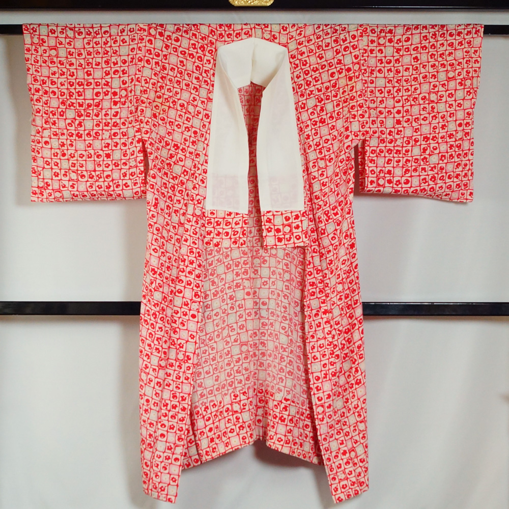 アンティーク 長襦袢 格子に椿、万寿菊模様 ちりめん 着物リメイク・リフォーム用 素材用 正絹 中古 襦袢 リサイクル着物 天陽